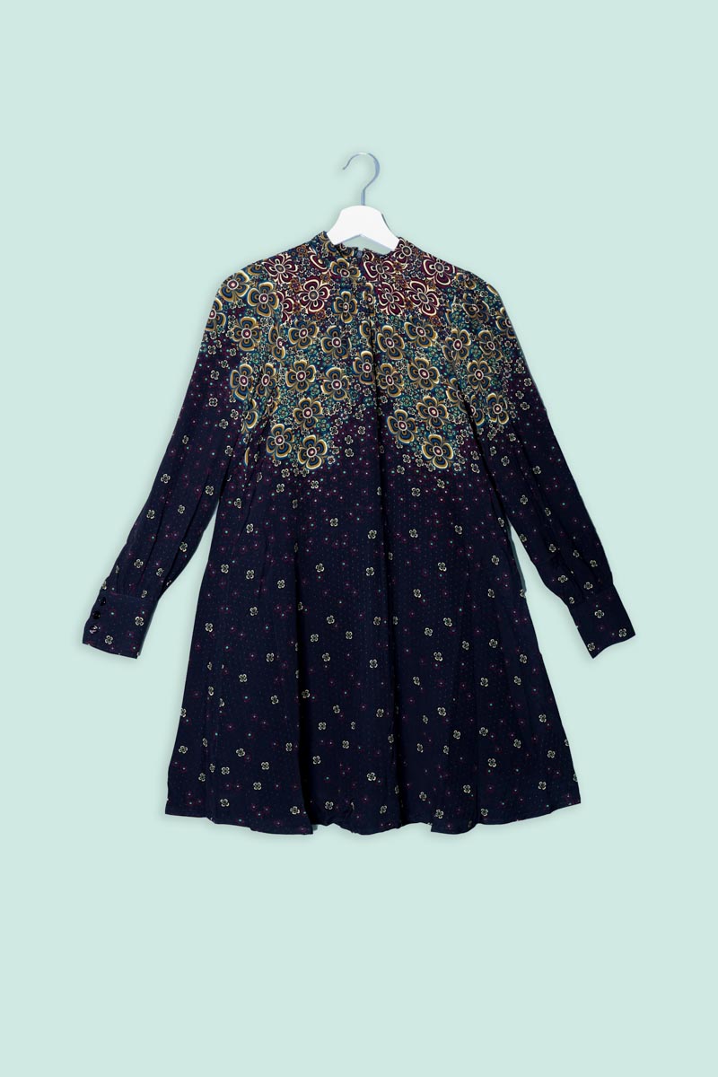 L’abito Sandy Dress Ombra presenta un colletto alla coreana, una fantasia floreale e maniche lunghe con polsini.