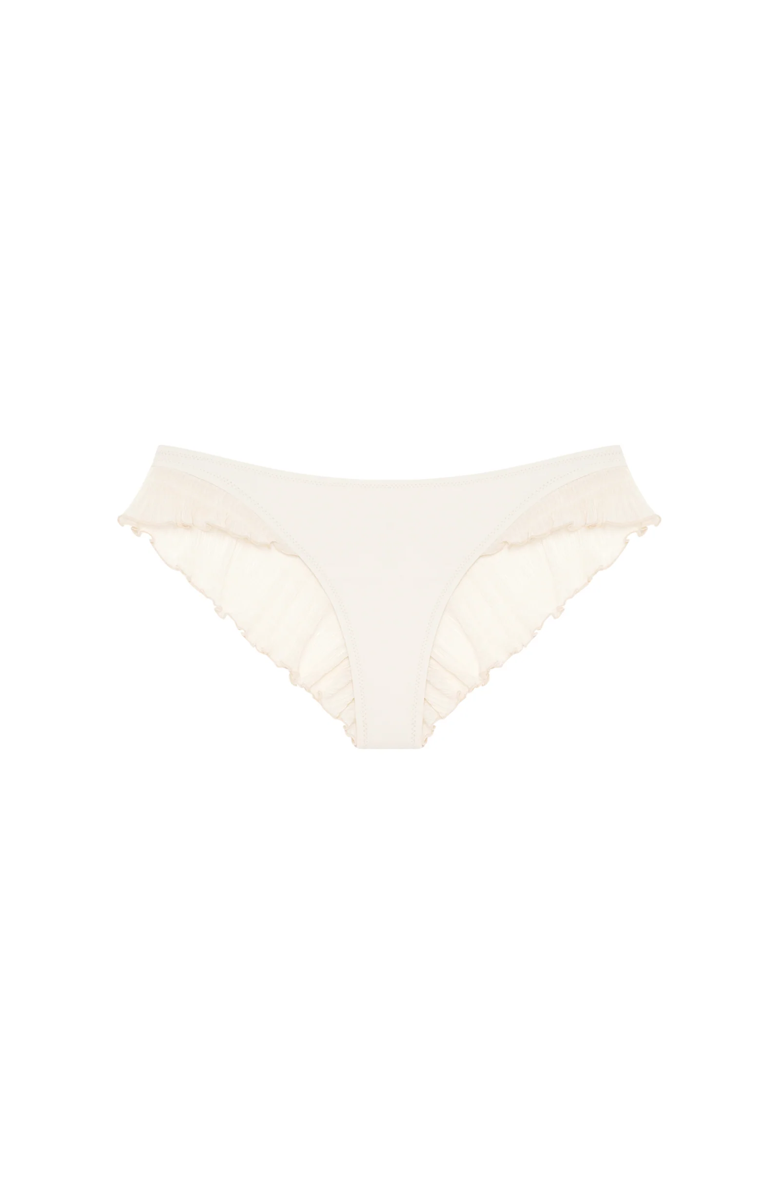 Iconic Pain de Sucre model, the bikini thong ALALA will seduce many women. The pleated voile ruffles at the back and on the sides give volume to your silhouette. Between bikini bottoms and lingerie, play the seduction card while asserting your femininity. Ivory, a warm white with a subtle pearlescent sheen.