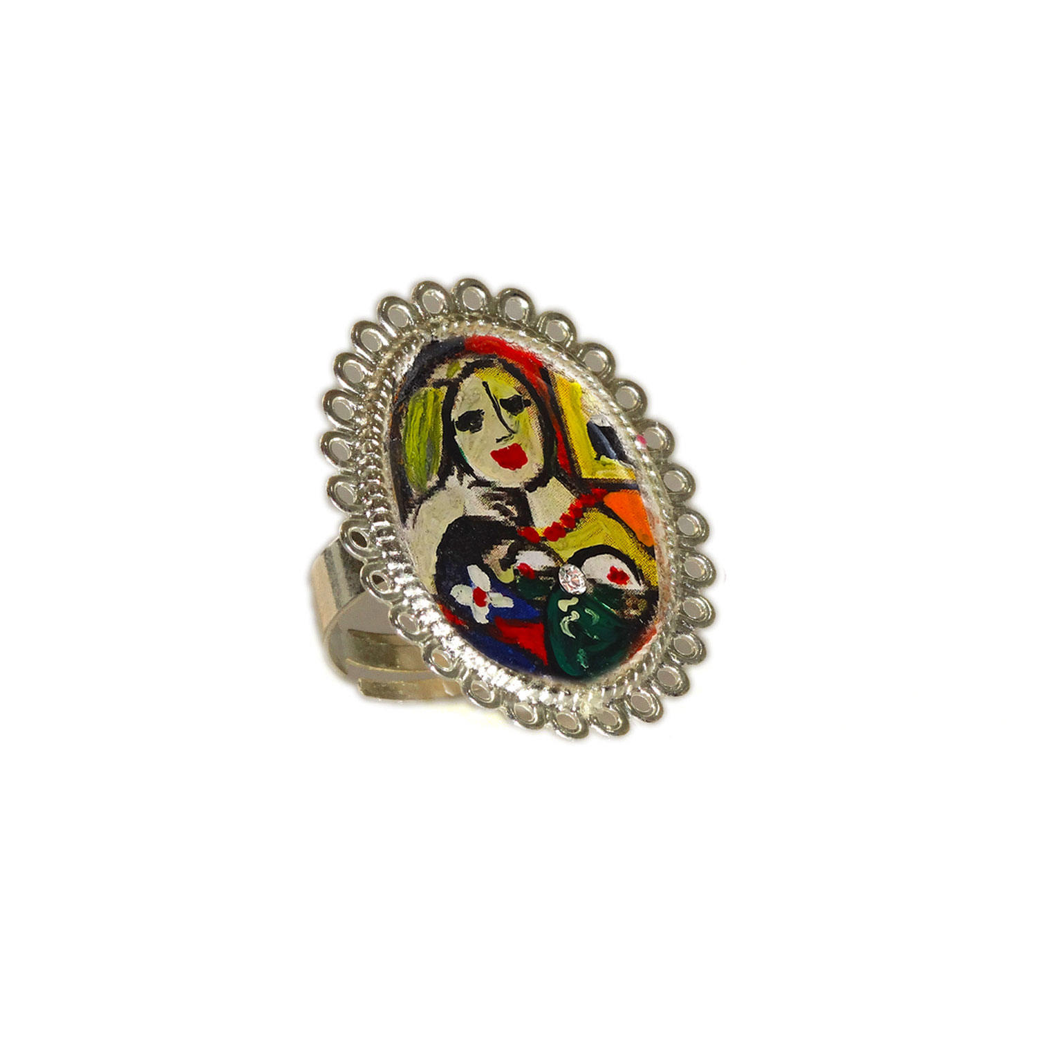 Anello con fascetta regolabile Forma: Ovale Toni: Color bronzo Materiale: Metallo – Nichel free Protezione: Resina spessa effetto vetro per proteggere il dipinto