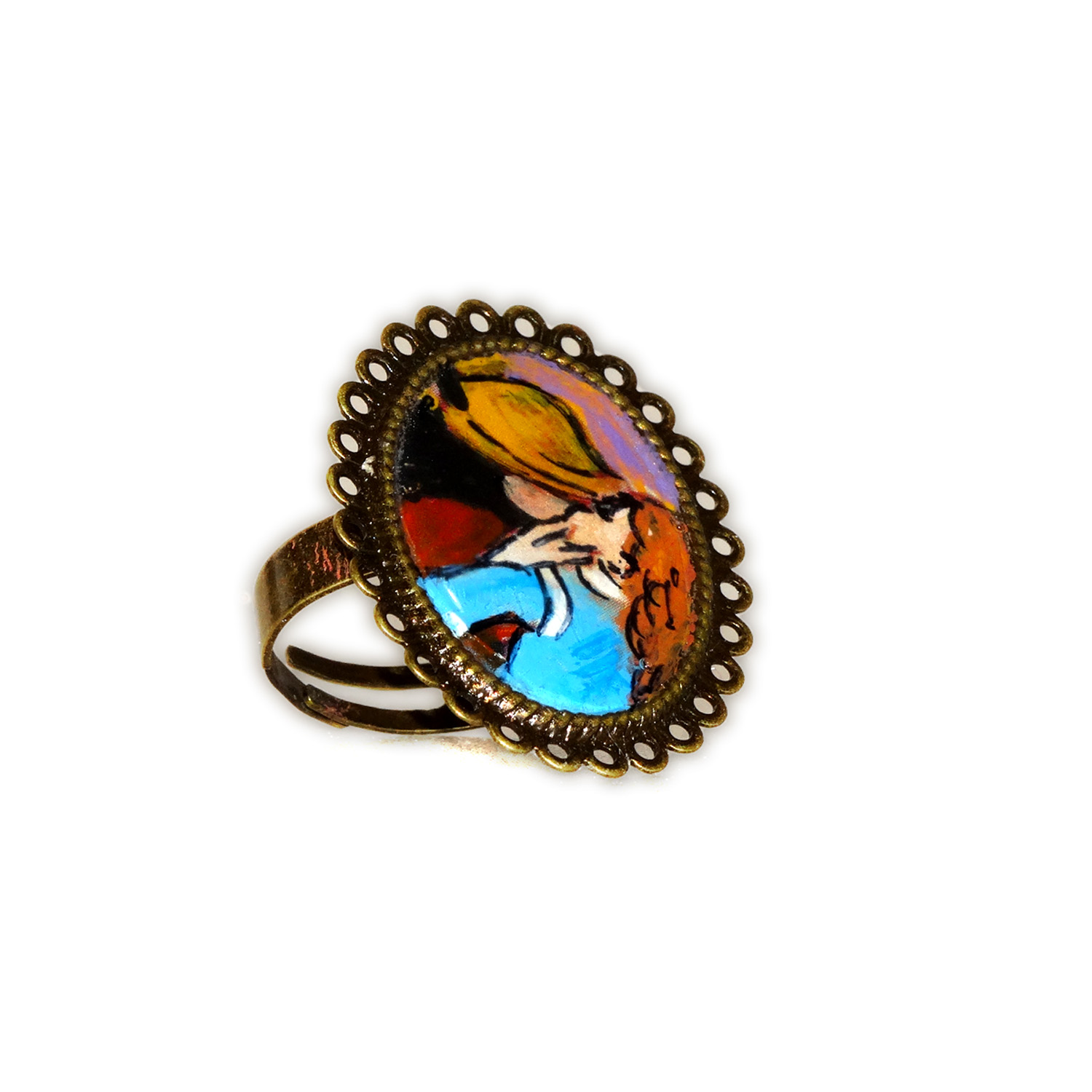 Anello con fascetta regolabile Forma: Ovale Toni: Color bronzo Materiale: Metallo – Nichel free Protezione: Resina spessa effetto vetro per proteggere il dipinto