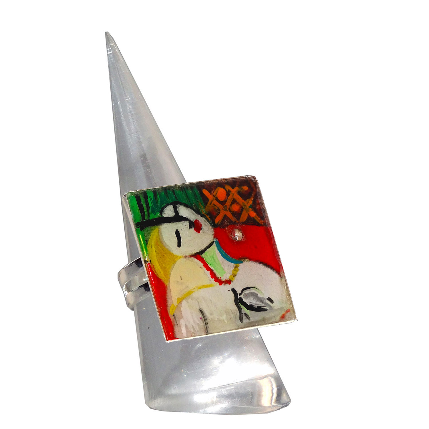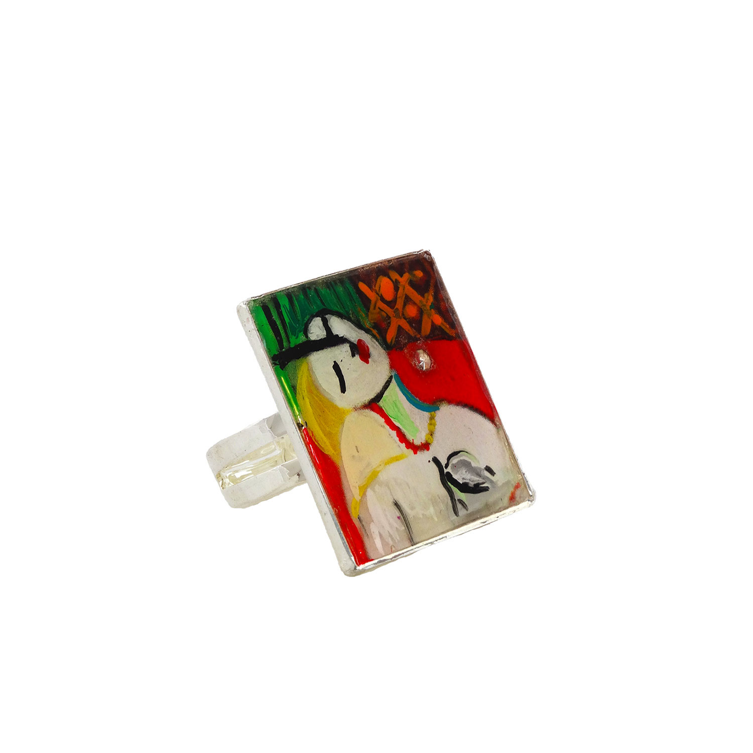 Anello con fascetta regolabile Forma: Quadrata Toni: Color argento Materiale: Metallo – Nichel free Protezione: Resina spessa effetto vetro per proteggere il dipinto