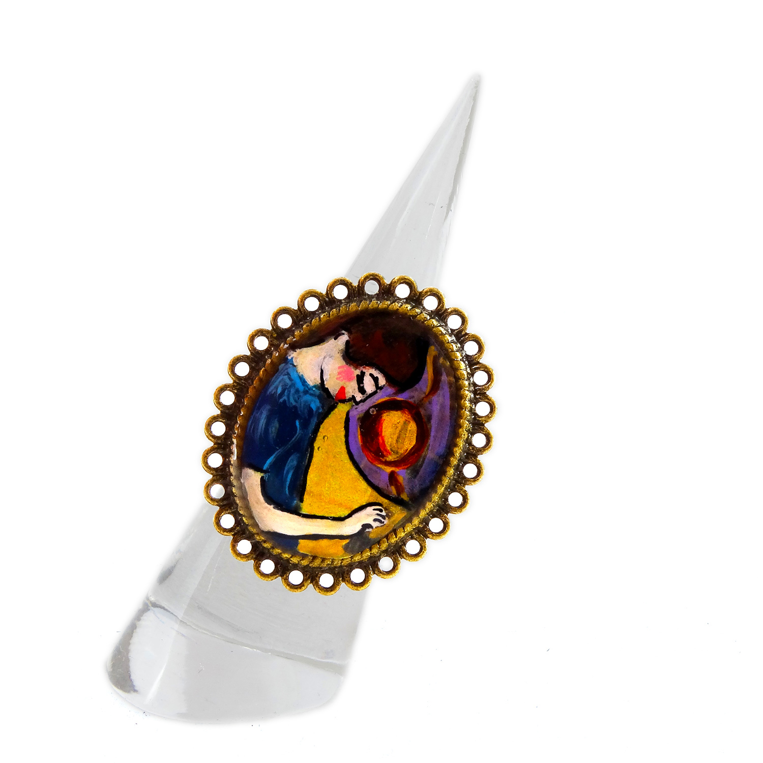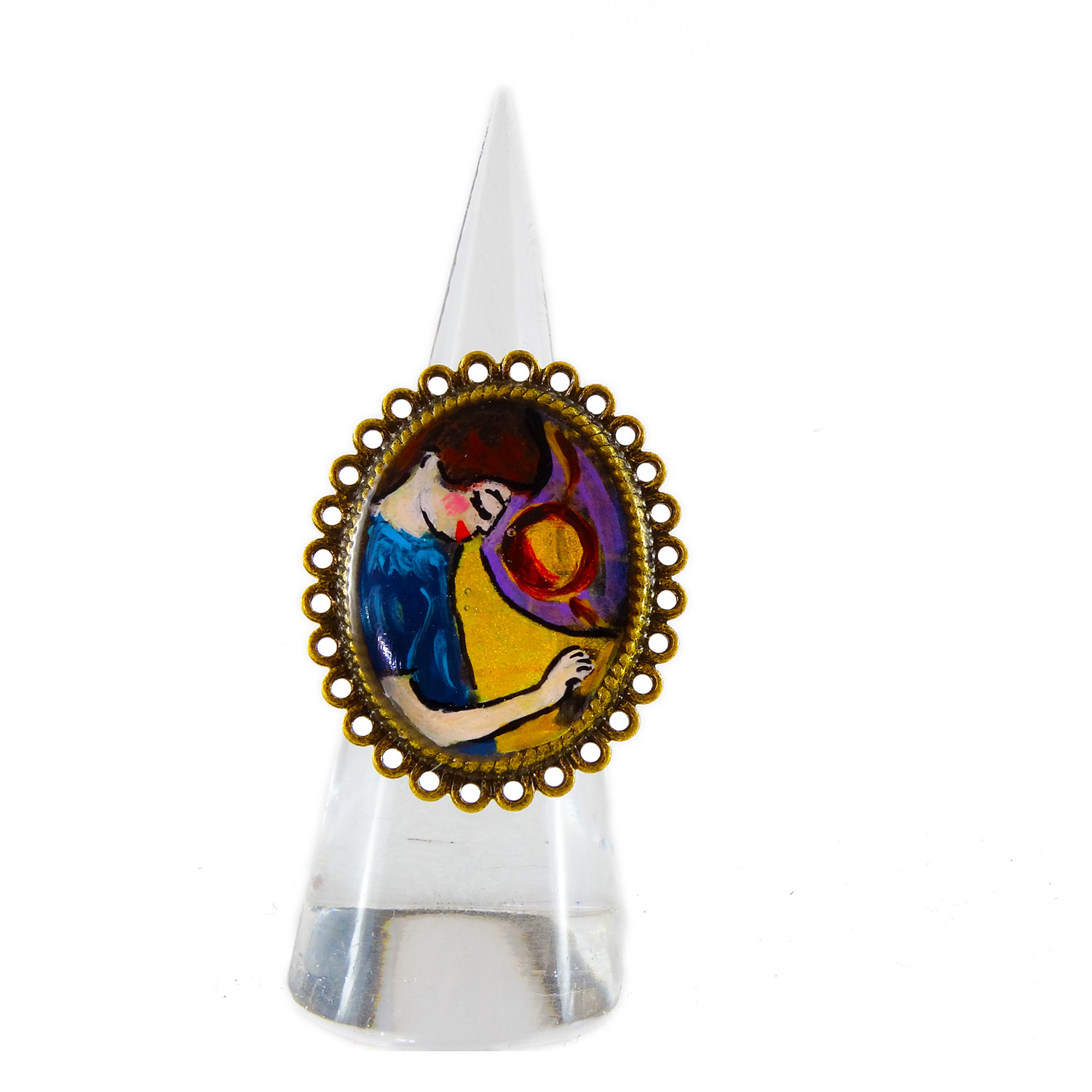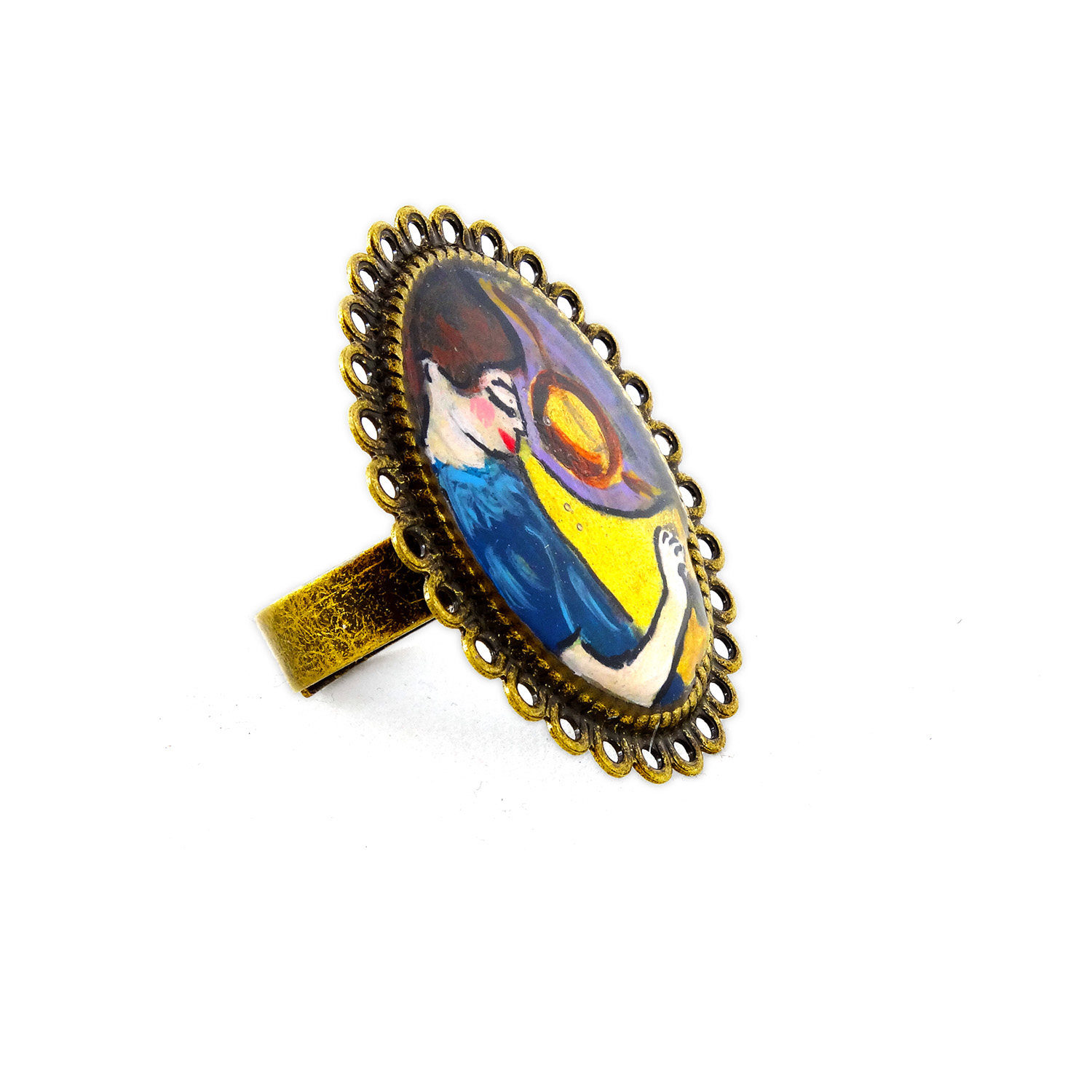 Anello con fascetta regolabile Forma: Ovale Toni: Color bronzo Materiale: Metallo – Nichel free Protezione: Resina spessa effetto vetro per proteggere il dipinto
