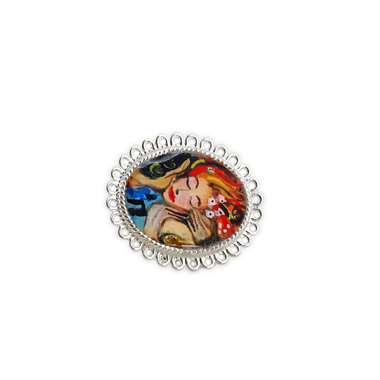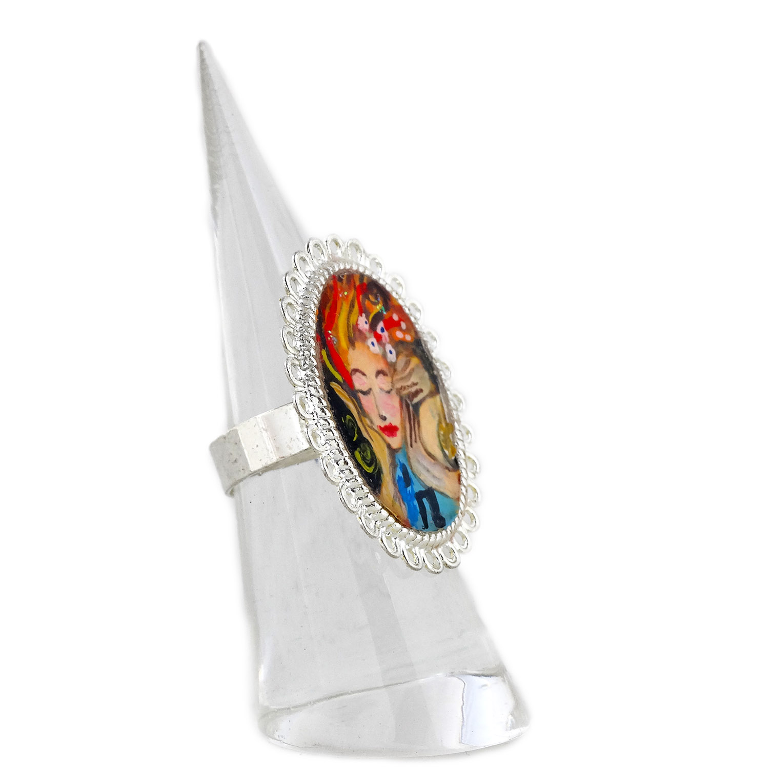 Anello dipinto a mano – Omaggio al Bacio Appassionato di Sophie Vogel: Due amanti che si stringono stretti racchiusi in un piccolissimo cammeo.