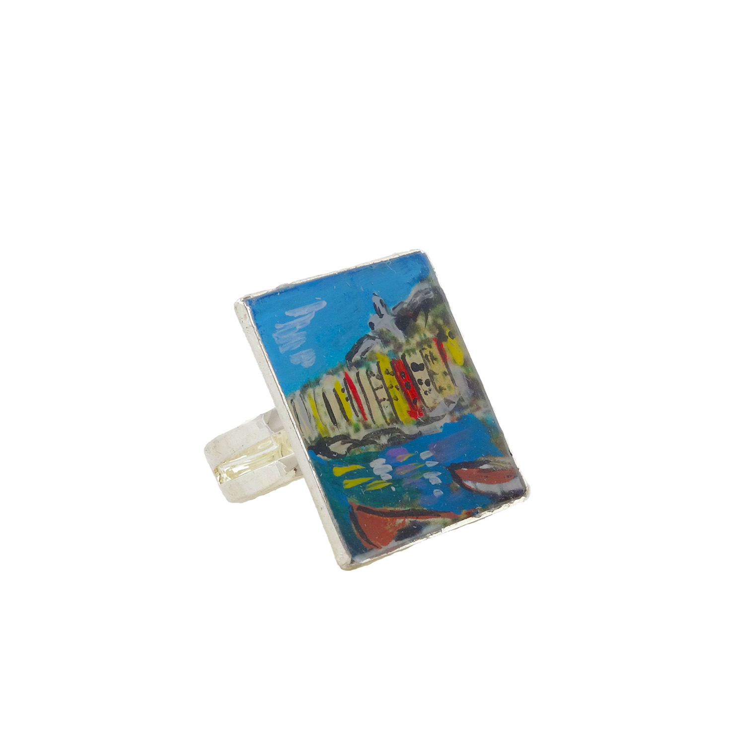 Anello dipinto a mano – Porto Venere: Il mare cangiante baciato dal sole con i suoi gozzi che galleggiano, le adorabili case colorate che baciano il Golfo dei poeti. Siamo a Porto Venere, nell’estremo levante della Liguria. In un’interpretazione tutta ArteLisanti.