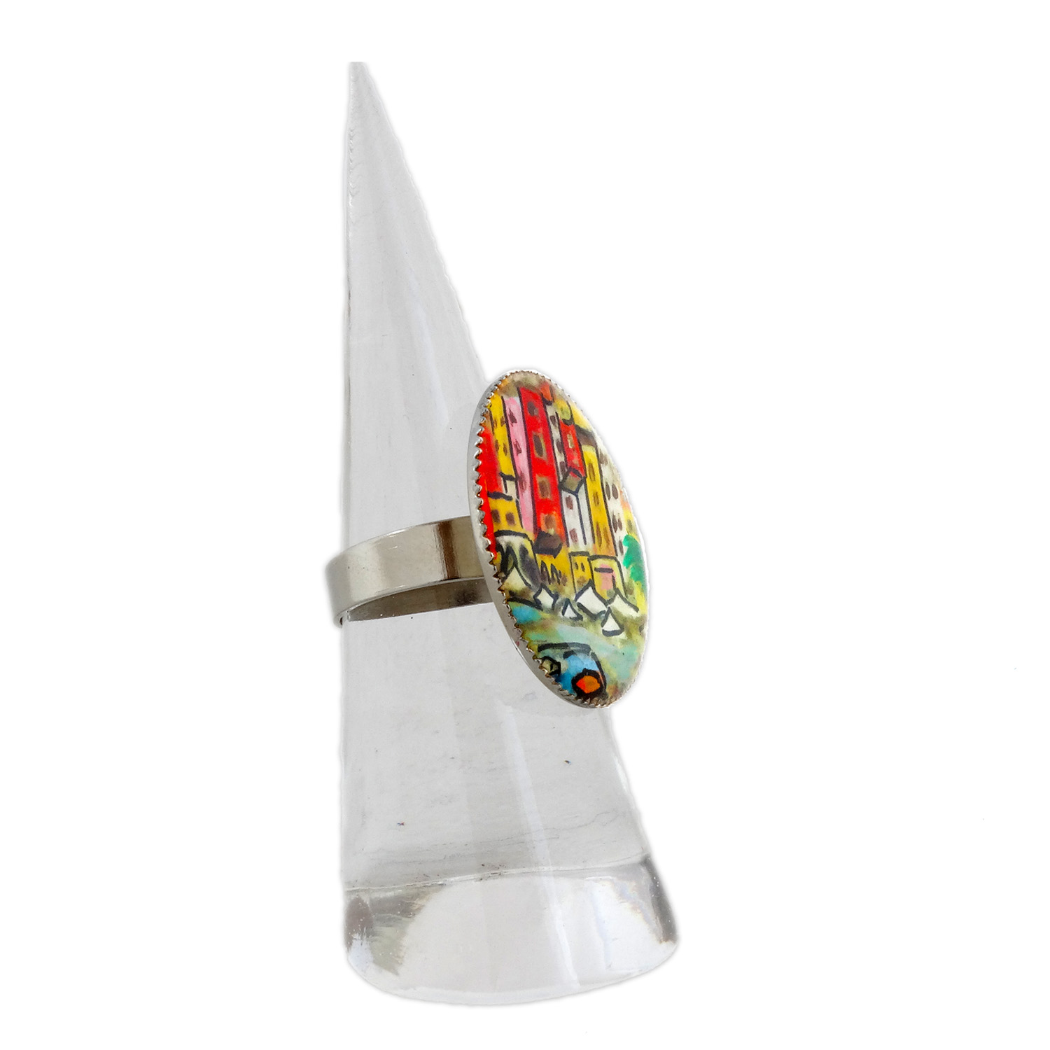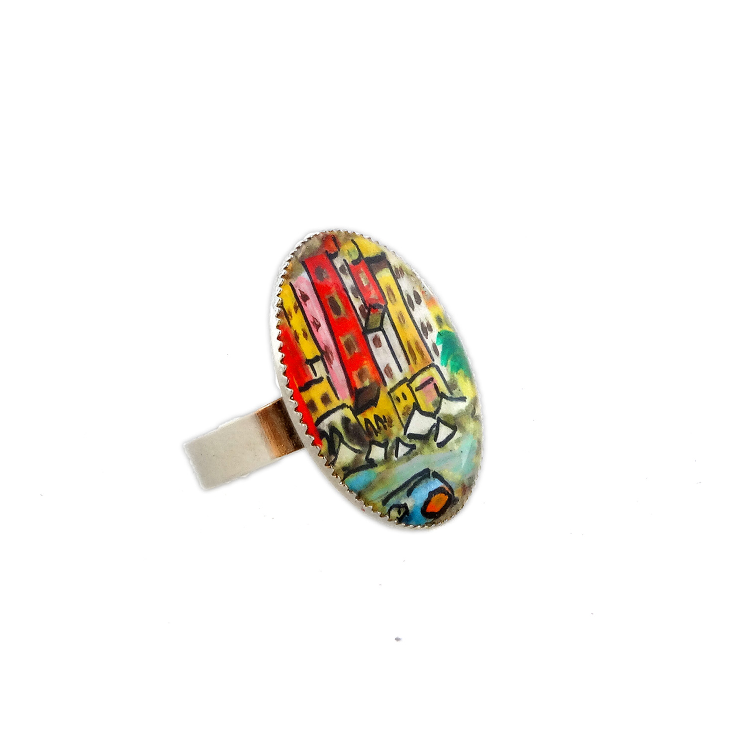 Anello dipinto a mano – Tramonto a Porto Venere: Piccole pennellate per le deliziose casette colorate di Porto Venere.