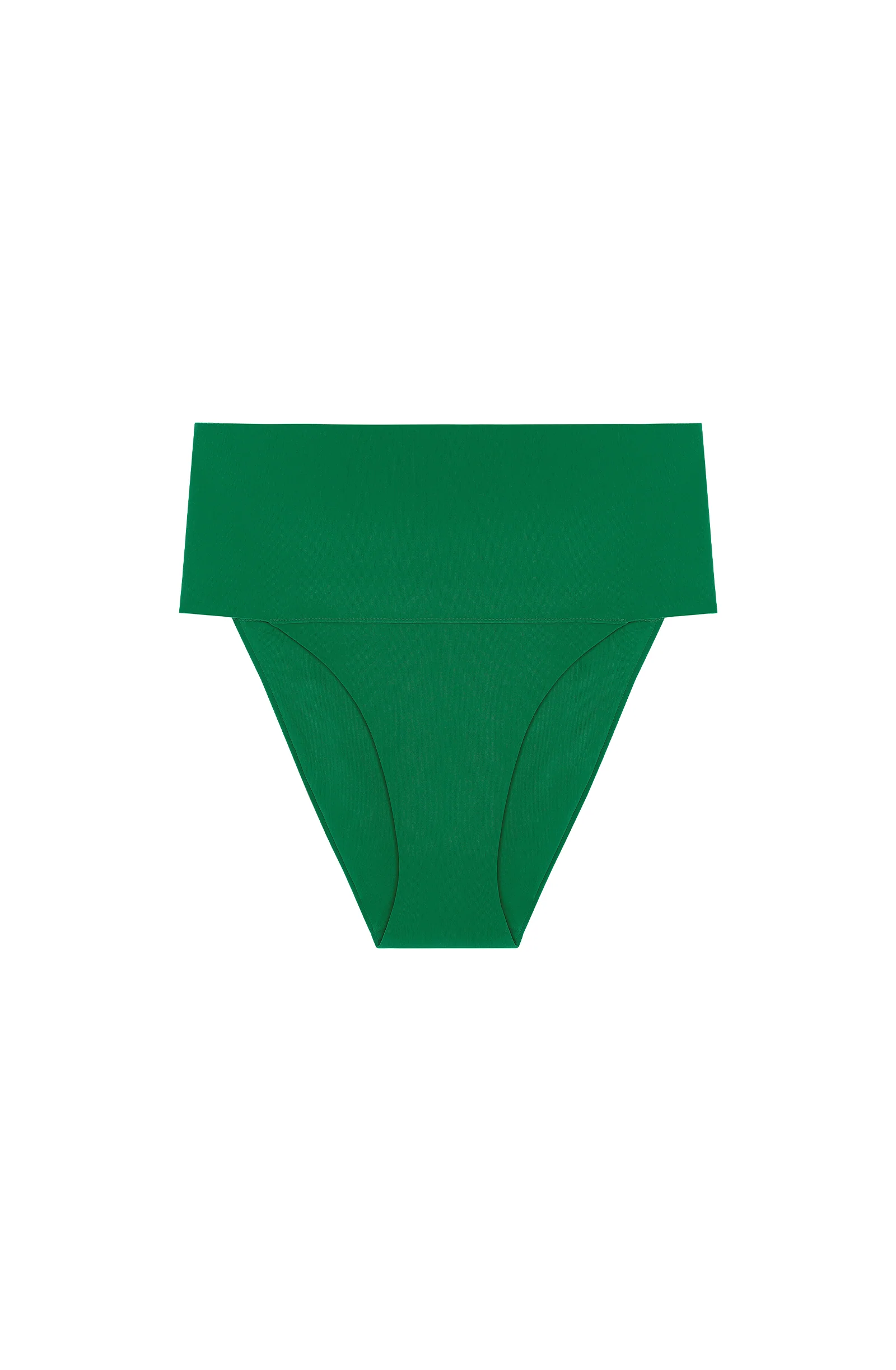 The high-waisted bottoms ANGIE perfectly cover the silhouette and slim the waist. Their fold-over waistband allows you to adjust these retro-looking bottoms according to your wishes. Jade, a bold green that is intensely soft and luminous.