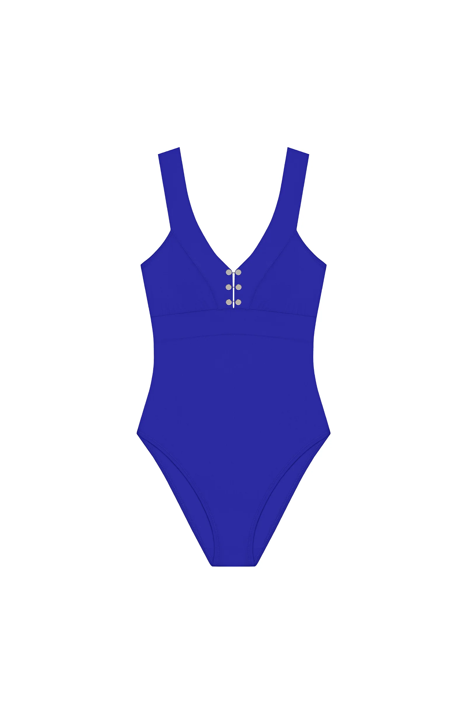 The ANTON one-piece swimsuit reinvents the iconic PIPPER, a signature model from the Pain de Sucre brand. Simple and graphic, the center of the bust is adorned with reversible silver cufflinks. These refined accessories allow you to personalize the neckline. Blueberry, a vibrant blue-violet like a wild berry.