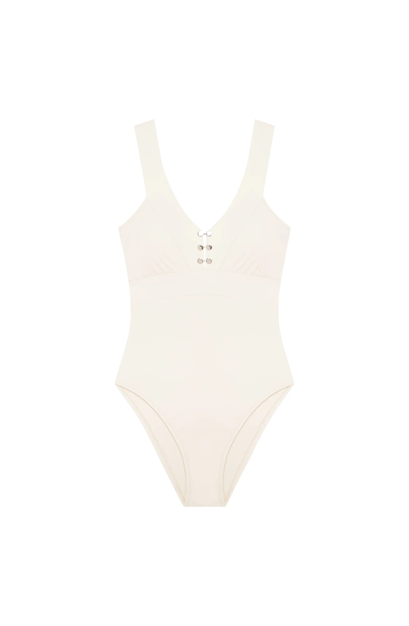 The ANTON one-piece swimsuit reinvents the iconic PIPPER, a signature model from the Pain de Sucre brand. Simple and graphic, the center of the bust is adorned with reversible silver cufflinks. These refined accessories allow you to personalize the neckline. Ivory, a warm white with a subtle pearlescent sheen.