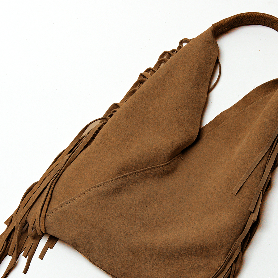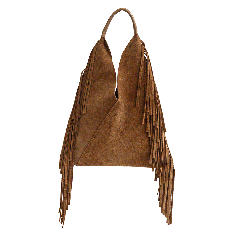 Sacca di medie dimensioni in camoscio con frange. Non ha chiusura, interno sfoderato.
