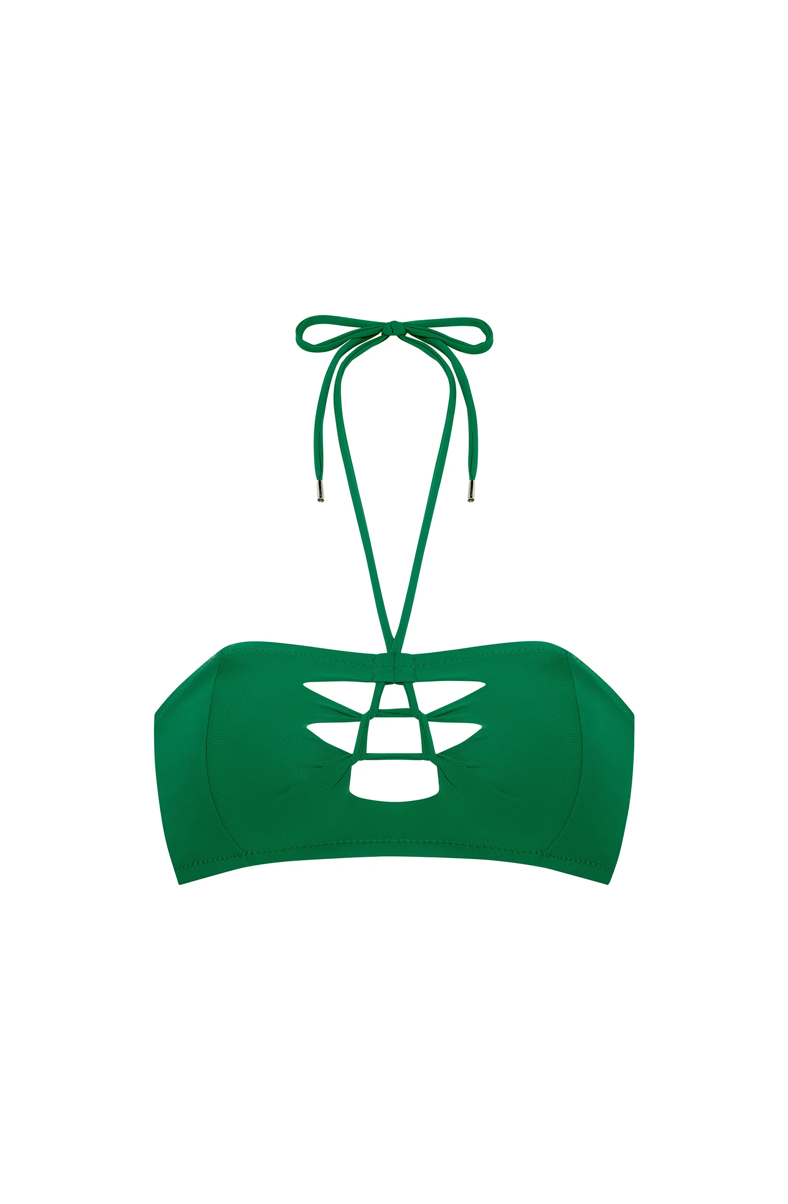 Simple and sophisticated, the BALA soft bandeau creates a plunging neckline with a striking graphic shape. Cut-out between the cups, the lycra intertwines in a modern, creative lacing design. Jade, a rich green that’s intensely soft and radiant.