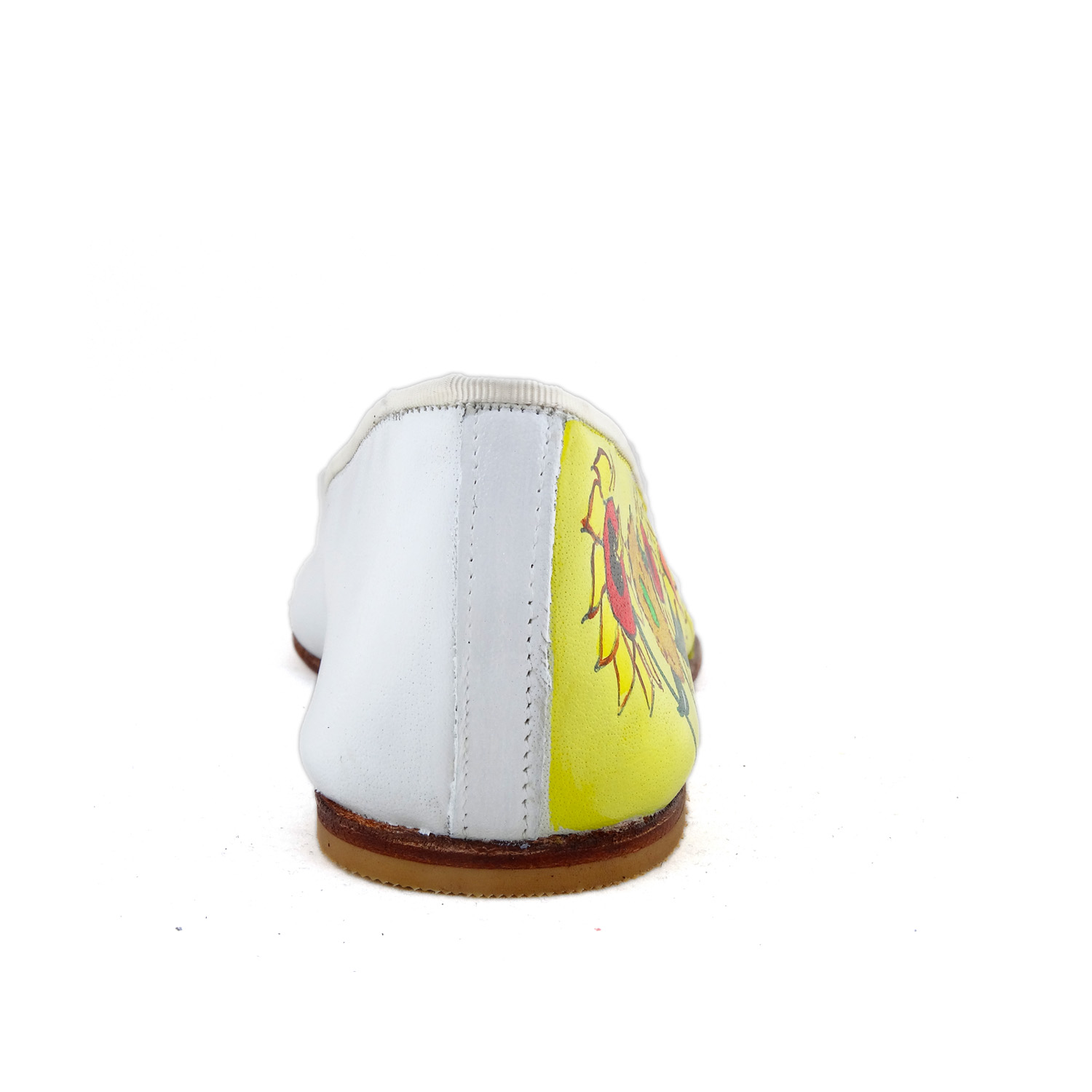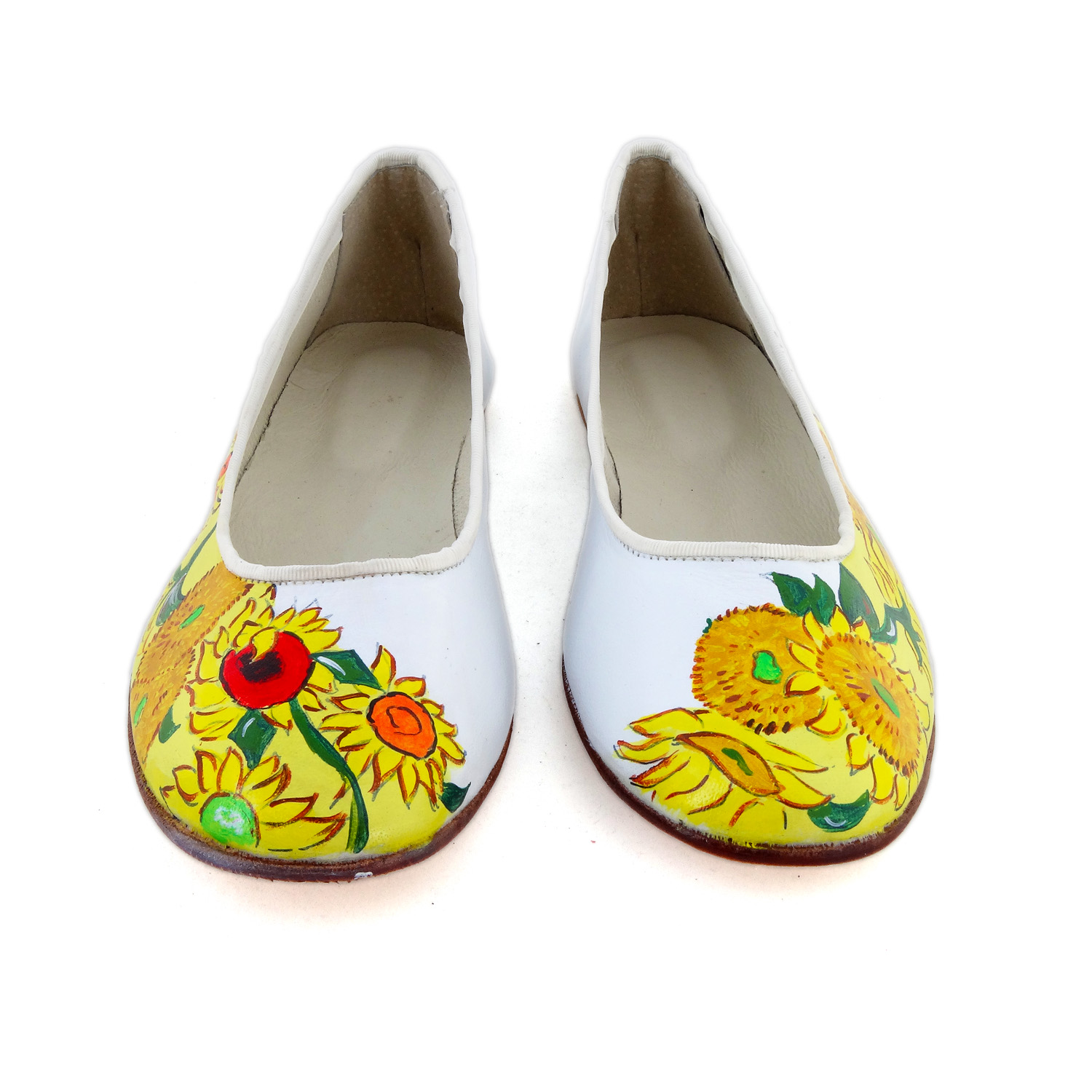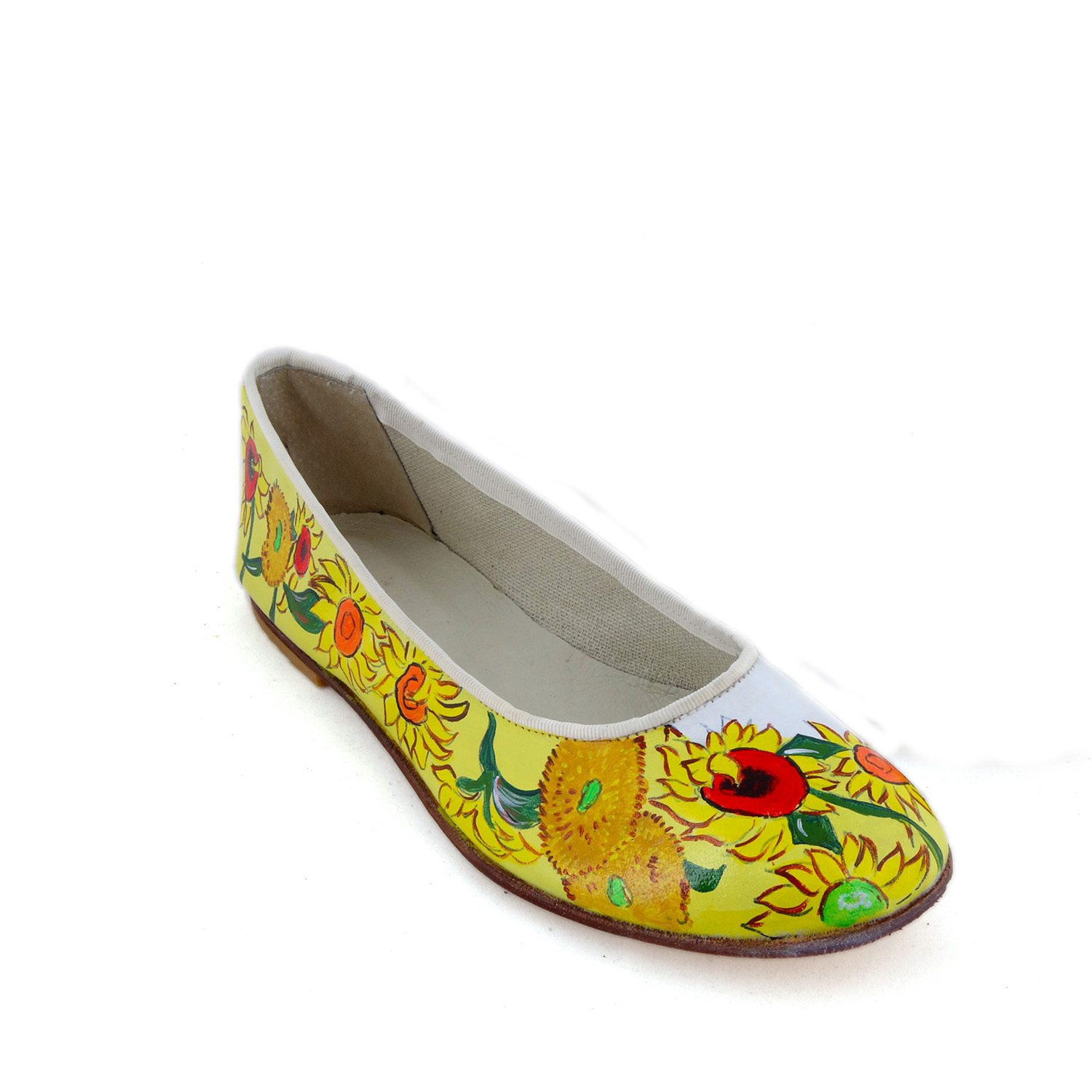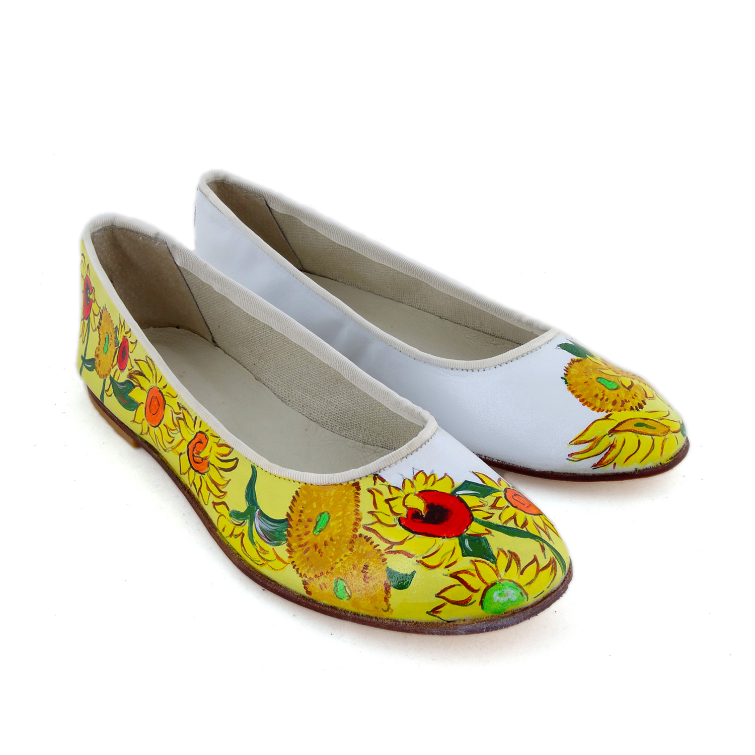 Ballerine dipinte a mano – I girasoli di Van Gogh : I Girasoli sono il soggetto che più di ogni altro è legato al nome di Van Gogh. Dettagli del celebre quadro decorano queste splendide ballerine bianche.