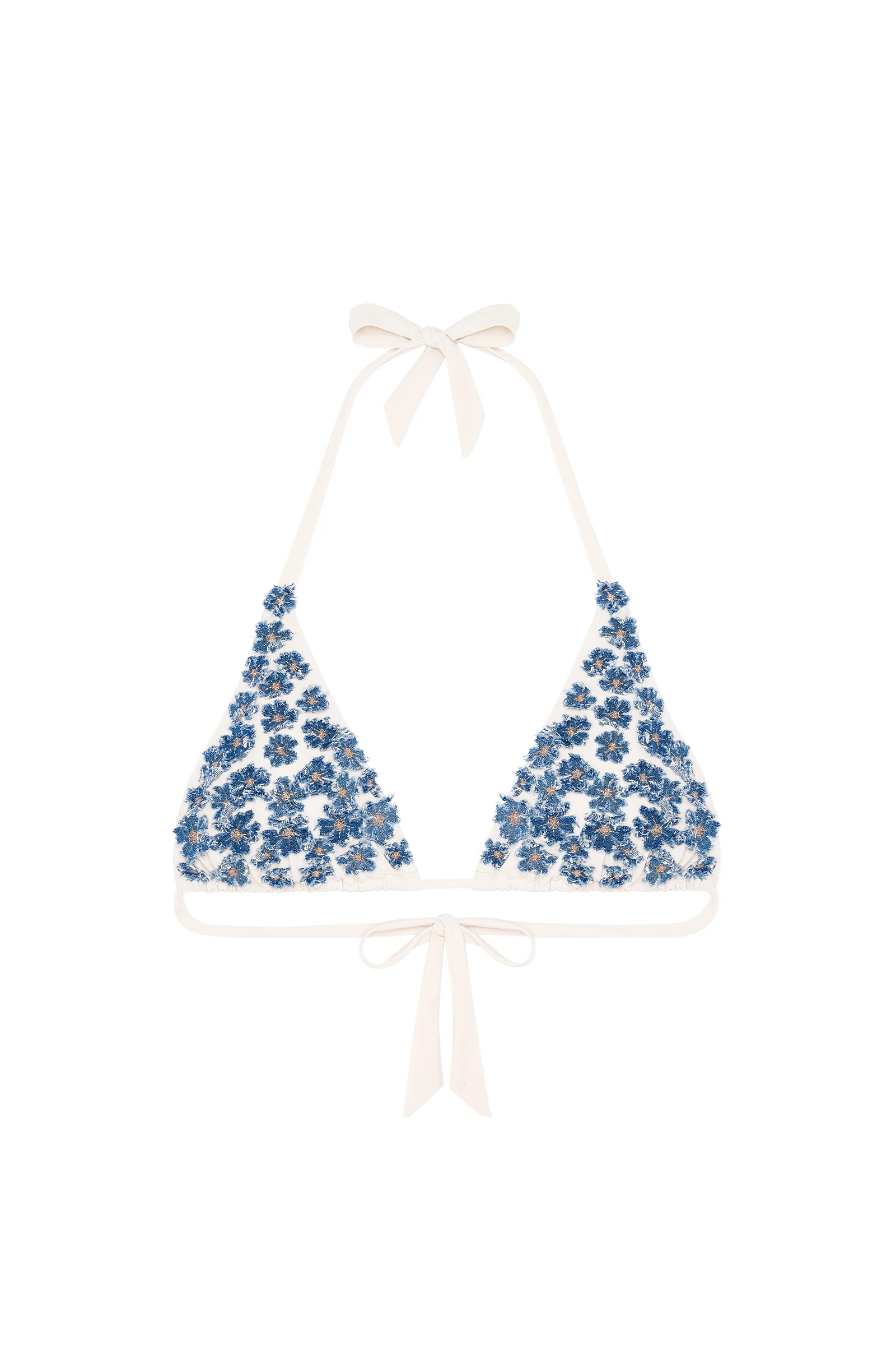 Avec ses triangles coulissants sur un lien fin, le haut de maillot BANO s’ajuste aux courbes avec légèreté. Ses bonnets se parent de fines fleurs en jean brodé, tout en relief. Un mélange sophistiqué d’étoffes pour ce bikini intemporel. Ivoire, un blanc chaleureux, légèrement nacré.