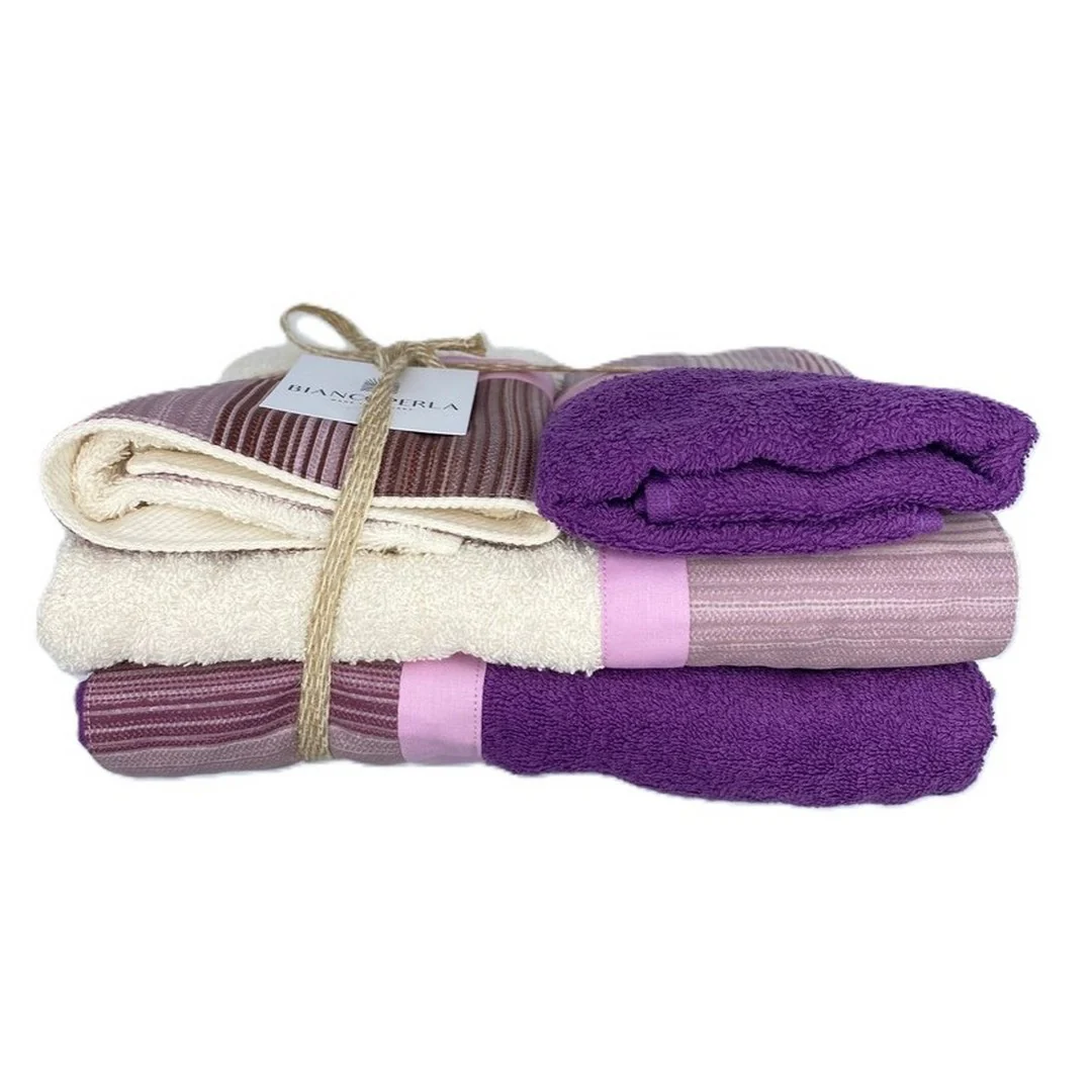 Elegante set da 2 coppie di asciugamani (2 viso + 2 ospiti) firmato Biancoperla, eccellenza Made in Tuscany.