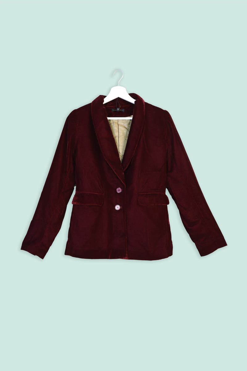 King Louie Blazer Gamine in Velluto Bordeaux King Louie Il blazer Brooke in velluto Gamine presenta tasche con patta e polsini con bottoni per un tocco di stile in più. Realizzato in velluto di poliestere intrecciato con tessuto elasticizzato, presenta maniche lunghe, collo a revers e una vestibilità regolare. La chiusura con bottoni garantisce una vestibilità sicura e confortevole per tutto il giorno. 55% poliestere, 45% viscosa Tessuto fustagno Tasche applicate Foderato Maniche lunghe Colletto a revers Aderente Chiusura con bottoni