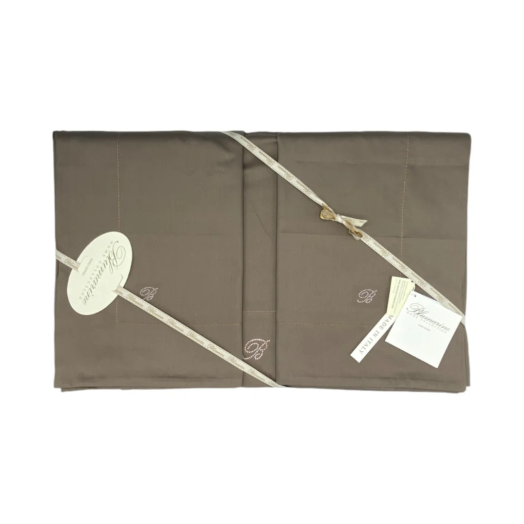 Lenzuola matrimoniale in puro raso di cotone tinta unita, federe a 3 volani decorate con logo Blumarine in cristalli Swarovski, lenzuolo sotto con angoli.