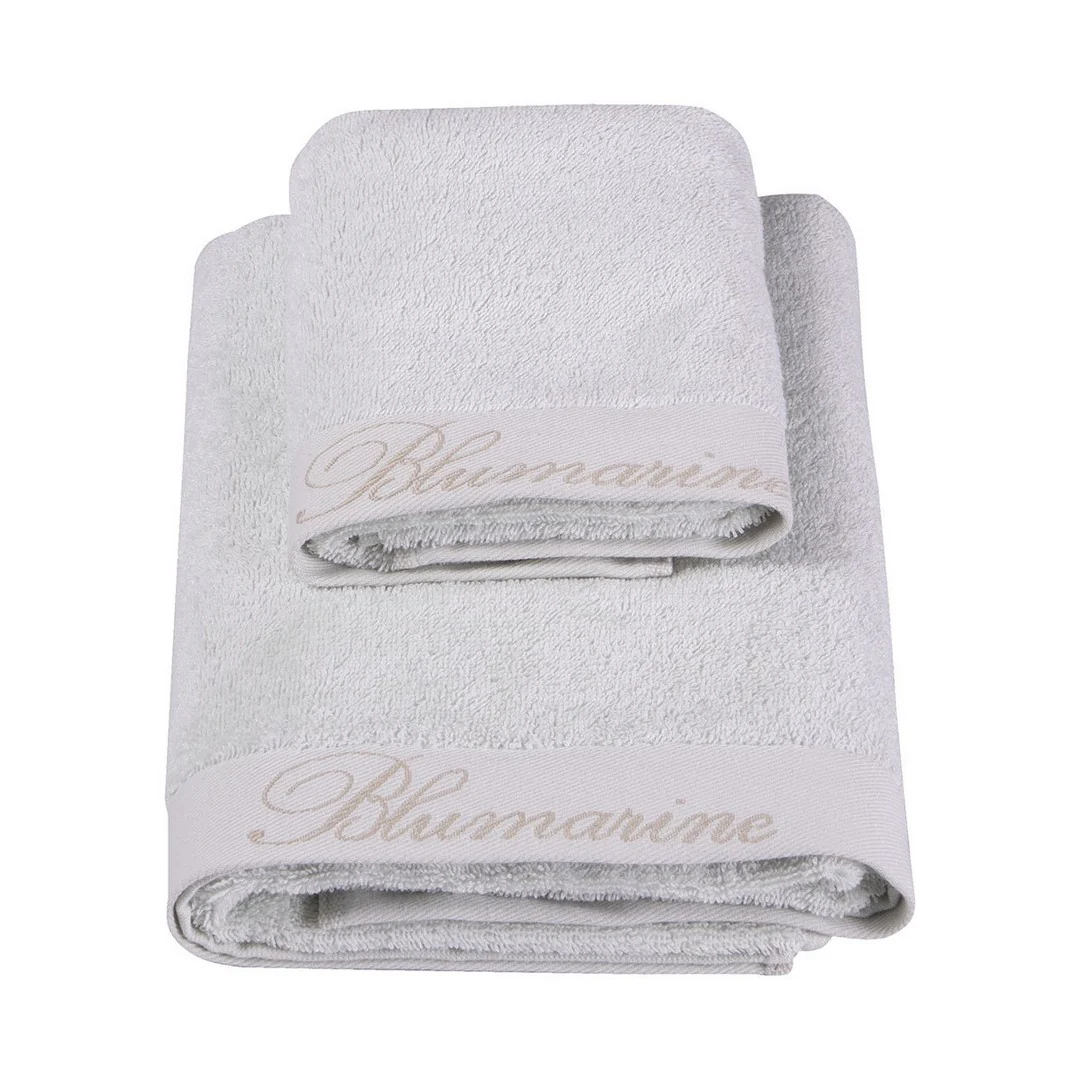 Coppia 1+1 di asciugamani in spugna di cotone con bordo e logo Blumarine in jacquard.