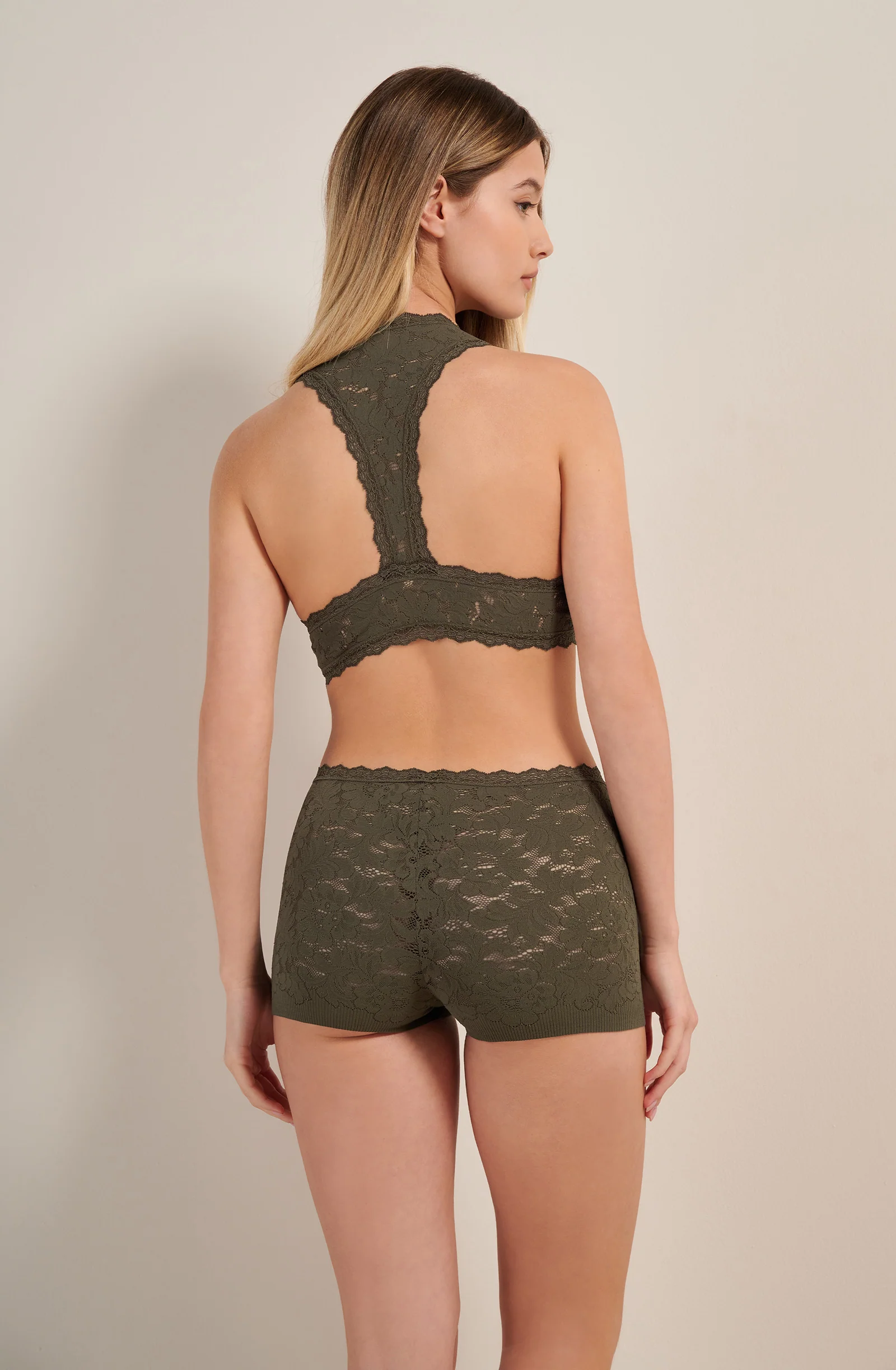 Made of stretch lace, the boyshorts BOBBY are a discreet basic piece that is very pleasant to wear. Their high waist is adorned with a delicate scalloped finish. Lichen green, an organic khaki green shade.