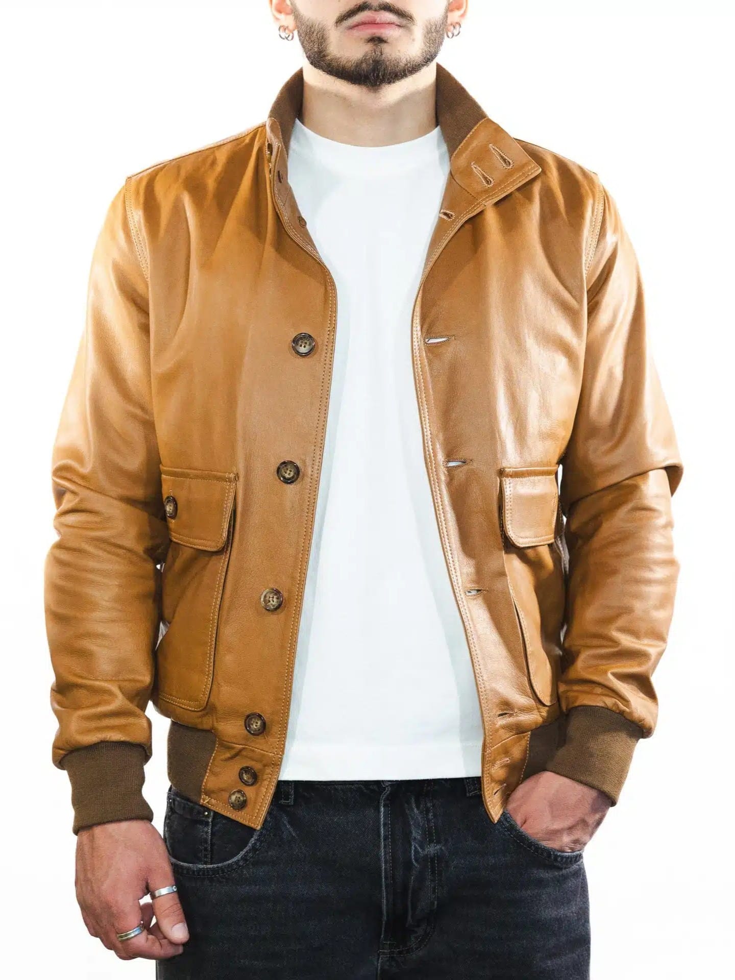 Chiusura frontale con bottoni Tasche frontali a vista con bottoni e tasche laterali Colletto classico, polsini e fondo elasticizzati Color Camel Regular fit Realizzato in Italia Pelle di agnello Concia al vegetale