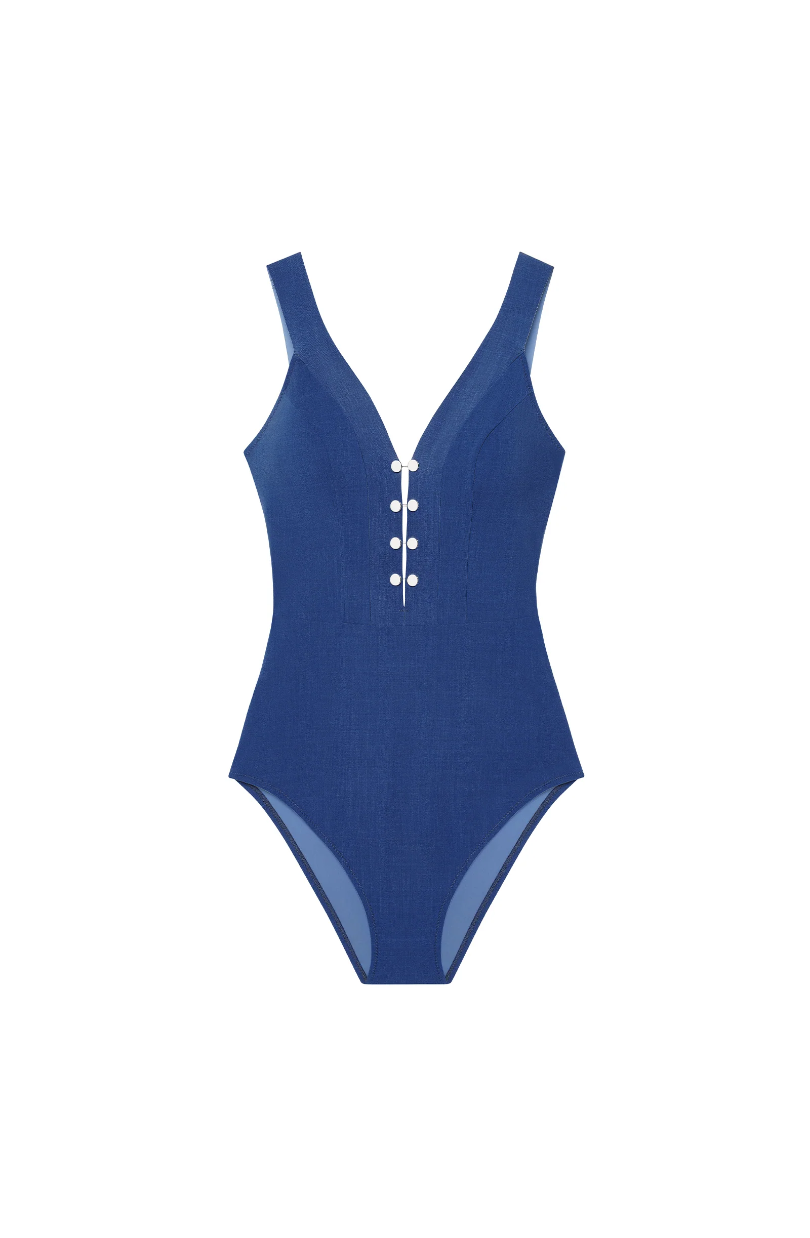BONNIE reinvents the racing swimsuit by giving it a new smart and feminine impulse. Resolutely elegant, this model is adorned with an extra tie to replace cufflink jewels. Its deep V- back and the seam underlining the waist bring a refined and original touch. The timeless jade swimsuit BONNIE, an exclusive signature of Pain de Sucre, fits all body types and ensures comfort and support, notably for generous breasts thanks to its wide Bonded Lycra® straps. Jean, the denim blue of a timeless fabric.