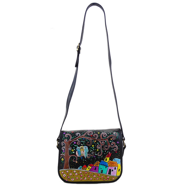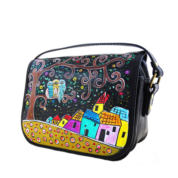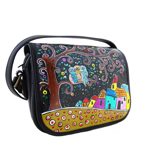 Borsa dipinta a mano – Ambarabà ciccì coccò: Le famose tre civette della filastrocca si poggiano su un albero dai rami riccioluti contornato da case colorate e un terreno che riprende elementi decorativi concentrici colorati.