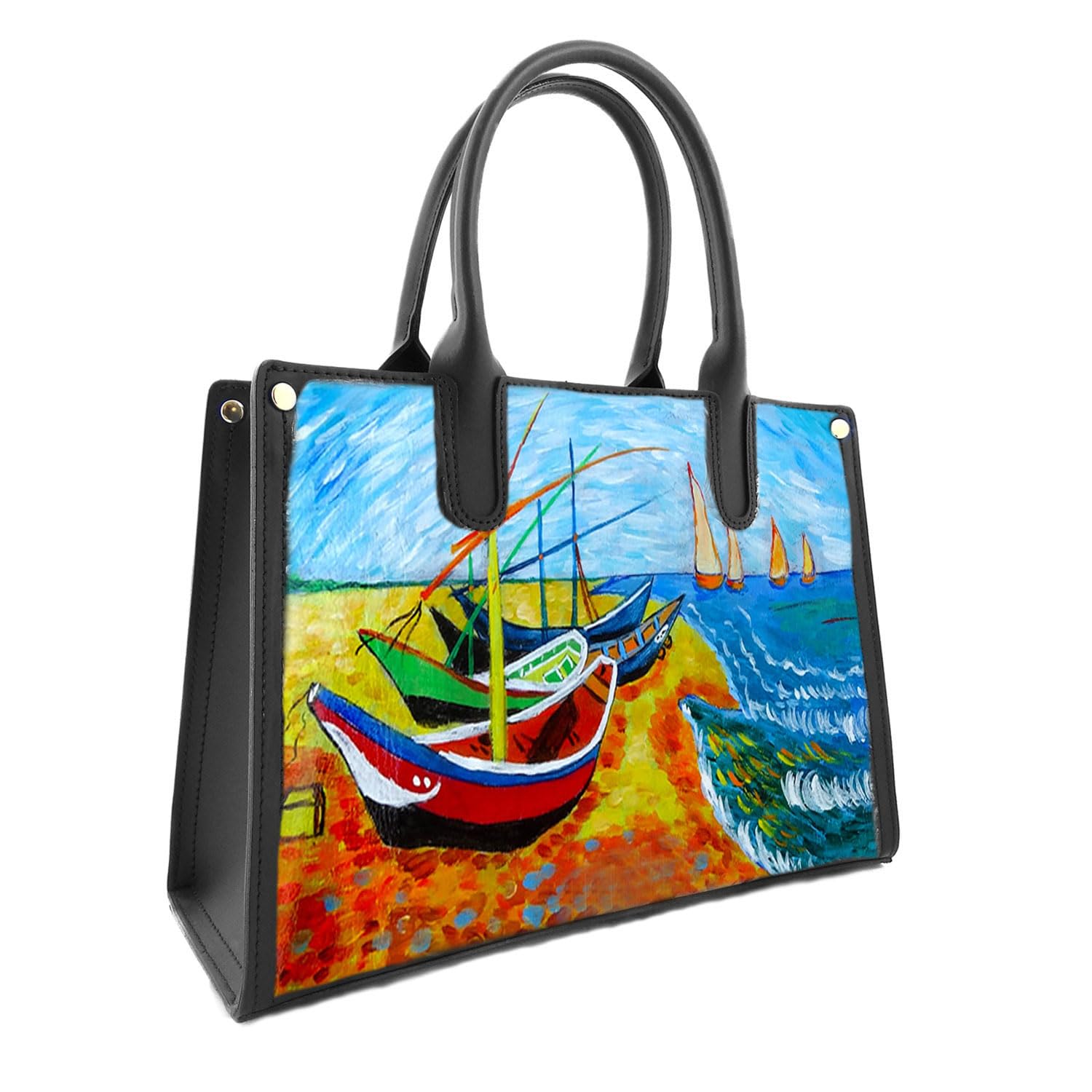 - Borsa in pelle dipinta a mano – Barche di Pescatori sulla spiaggia di Les Saintes-Maries-de-la-mer di Van Gogh: Made in Italy. Il celebre quadro “Barche di Pescatori sulla spiaggia di Les Saintes-Maries-de-la-mer” del pittore olandese Vincent Van Gogh, dipinto a mano su una fantastica borsa in pelle. La scena ricca di emozione e dettagli è riprodotta con alta qualità e proporzioni perfette, catturando l’intensità di uno dei dipinti più noti del pittore impressionista.