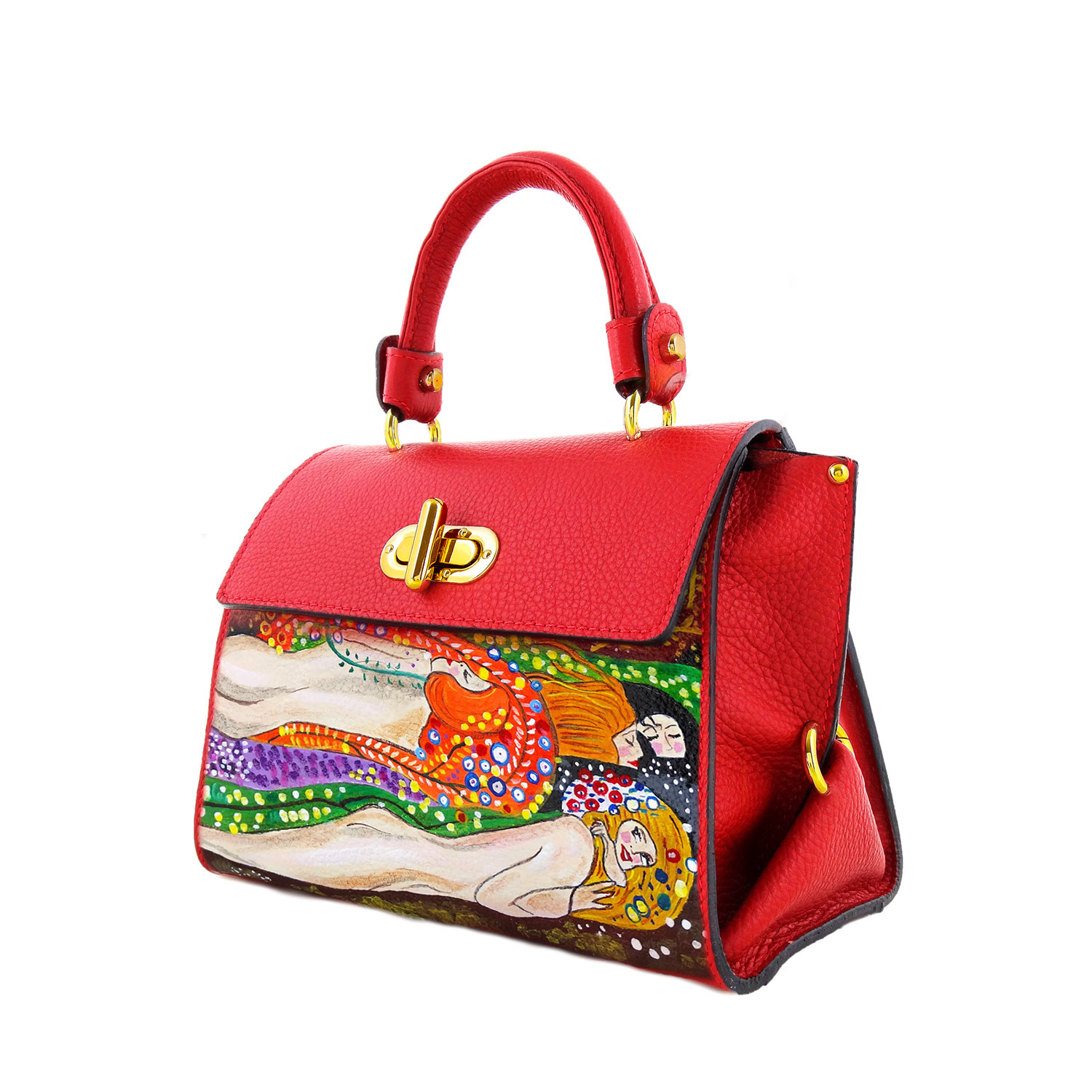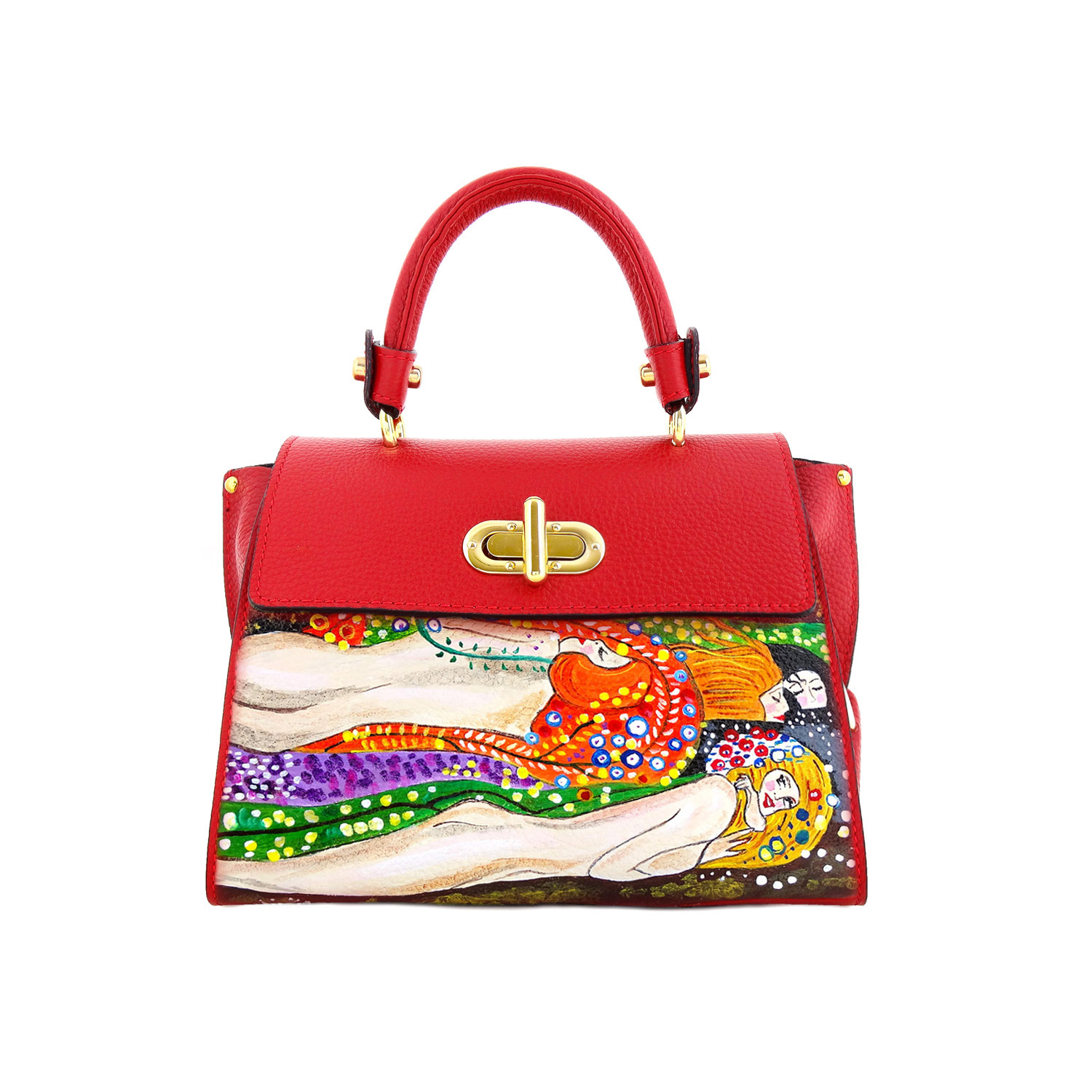 Borsa dipinta a mano – Bisce d’acqua di Klimt: I corpi sinuosi delle donne di Klimt avvolti da colore e dettagli oro. Borsetta artigianale, variopinta ricca di dettagli.