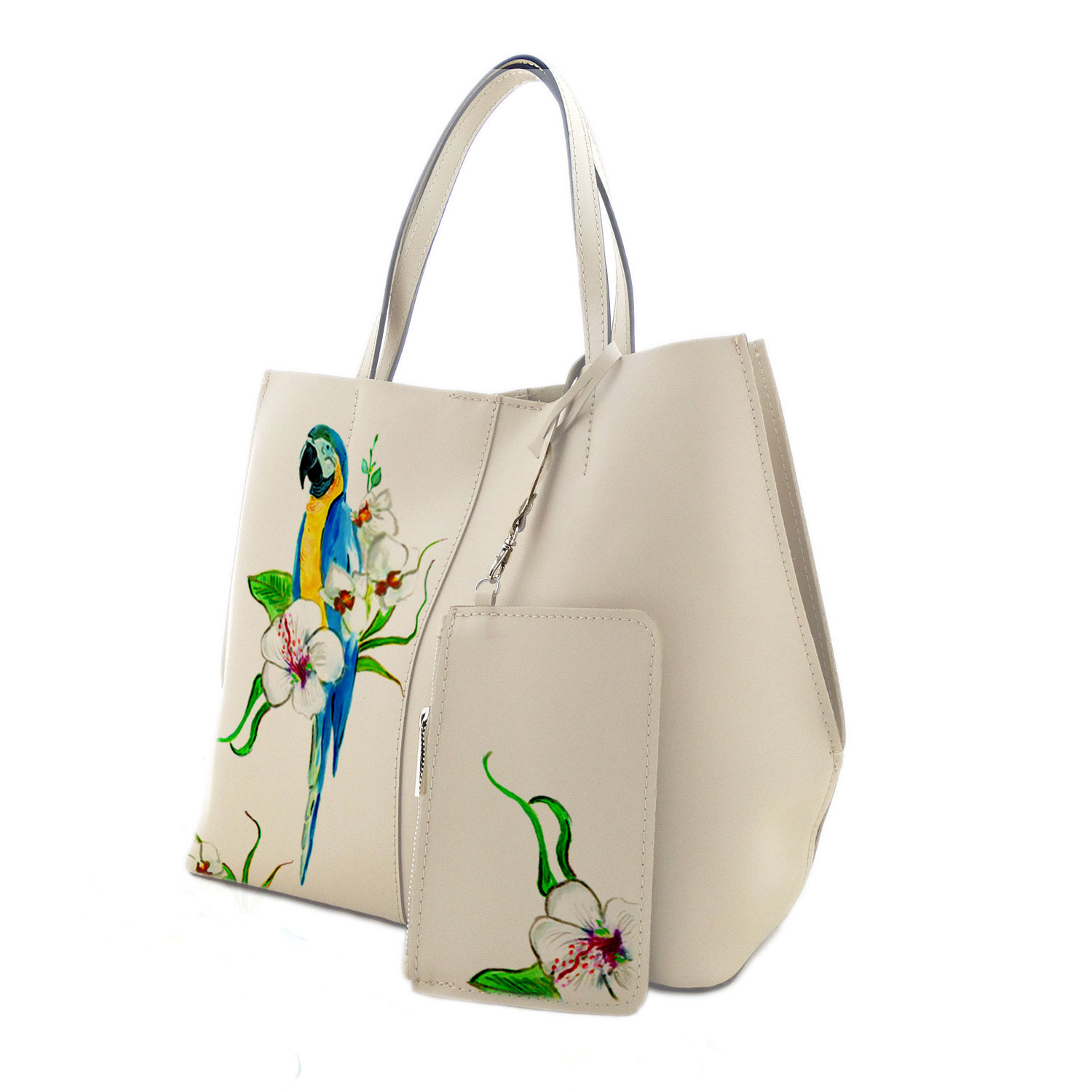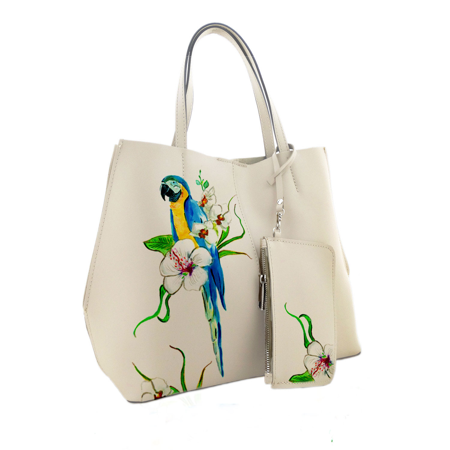 Borsa dipinta a mano – Blue parrot: Tropical effect con fiori tropicali e un colorato ed esotico pappagallo.