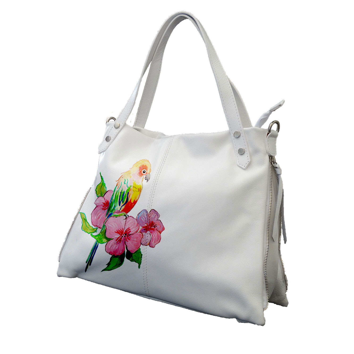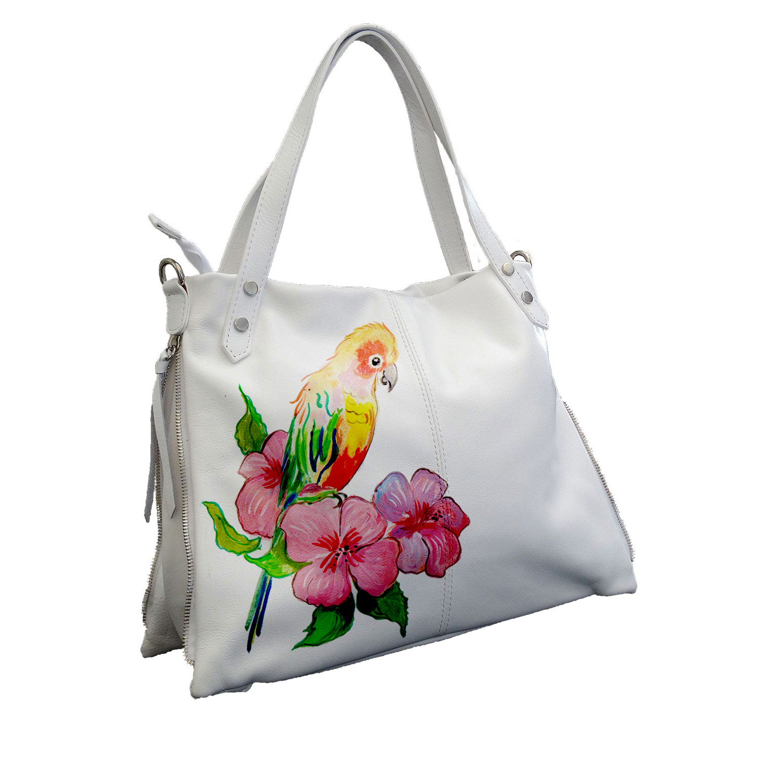 Esterni Caratteristiche: Costruzione morbida in vera pelle, Dipinto eseguito a mano. Chiusura con zip, Le zip laterali sono decorative, Tasca con zip sul retro Interni: con unico scomparto e zip interna portadocumenti in poliestere. Accessori: Tracolla lunga montabile ad esigenza Colore base: Bianco Dimensioni: 37 cm. x 29 cm. x 12 cm. Altezza manici 17 cm Vera pelle morbida – Made in Italy