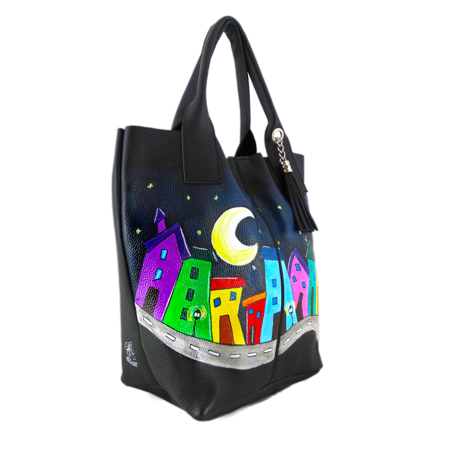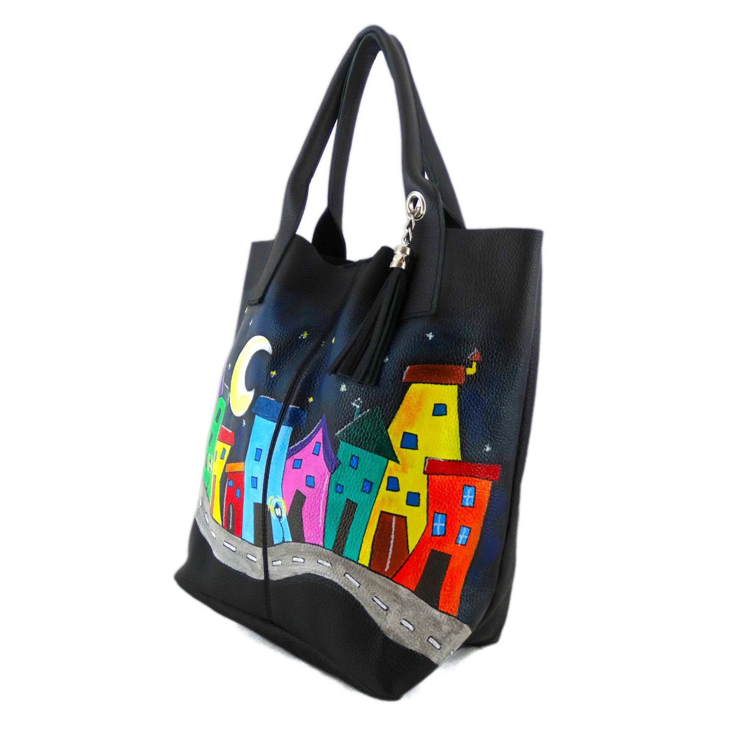 Borsa dipinta a mano – Crazy village: Borsa artigianale con colorate casette dalle forme estrose prendono forma su una pazza strada al chiaro di luna. Borsa variopinta decorata a mano 100% made in Italy