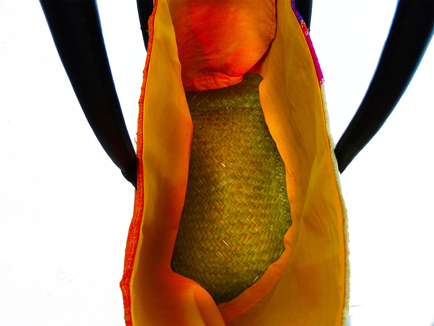 Esterni: Costruzione semirigida – Rafia 100% naturale provenente dal Madagascare – Chiusura con coulisse in stoffa – Manici e rinforzi laterali in ecopelle Interni: Tasca portacellulare – Sfoderata Dimensioni: 46 cm x 30 cm x 20 cm