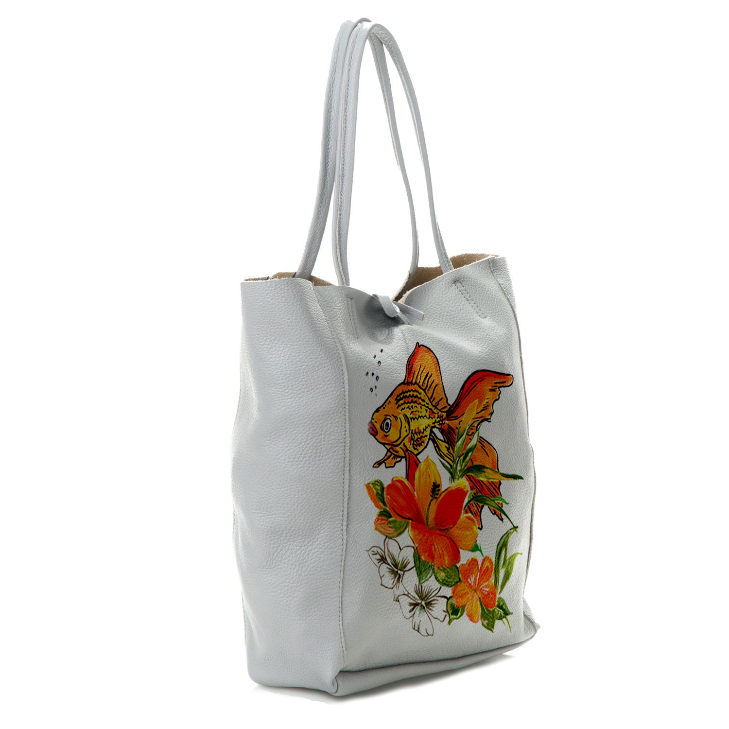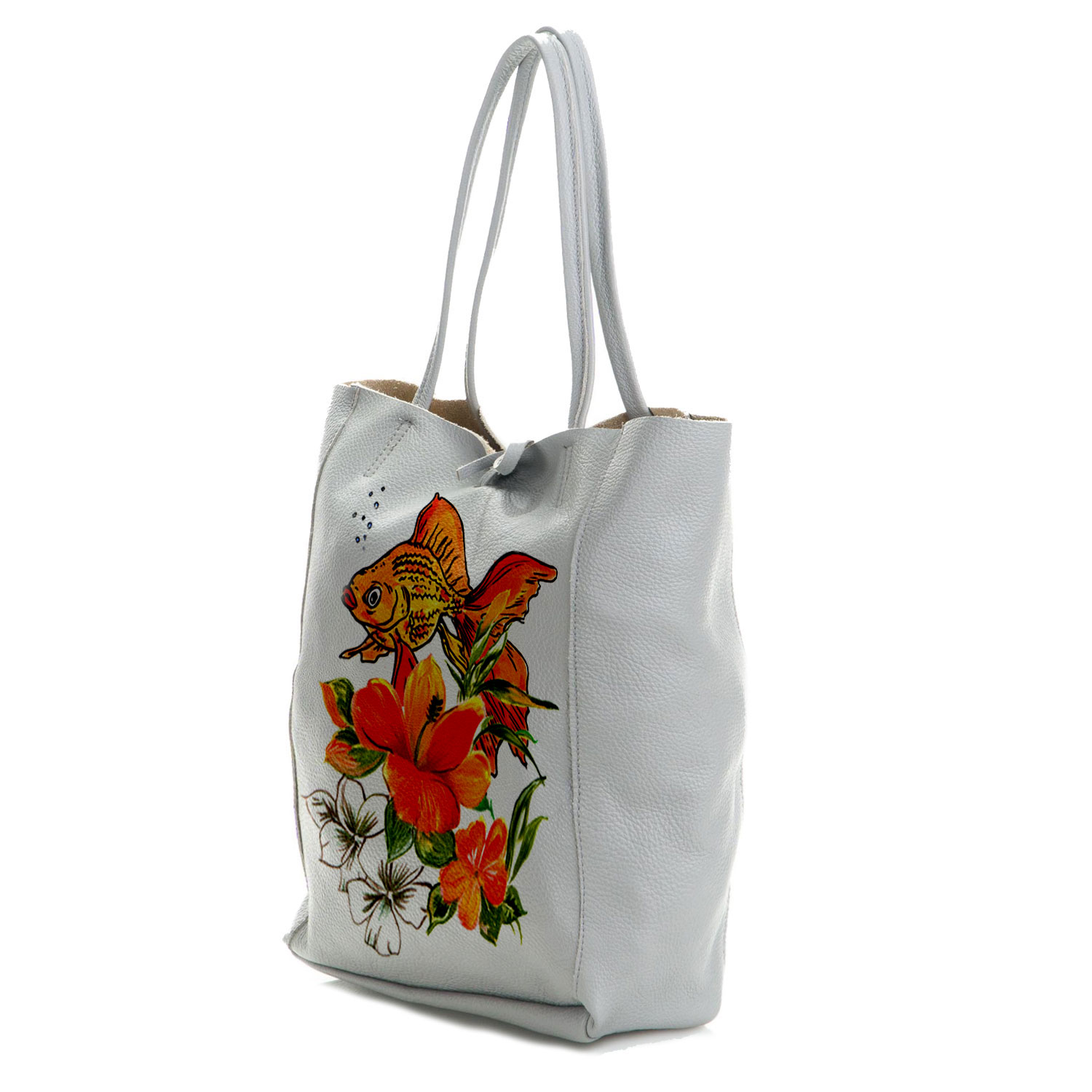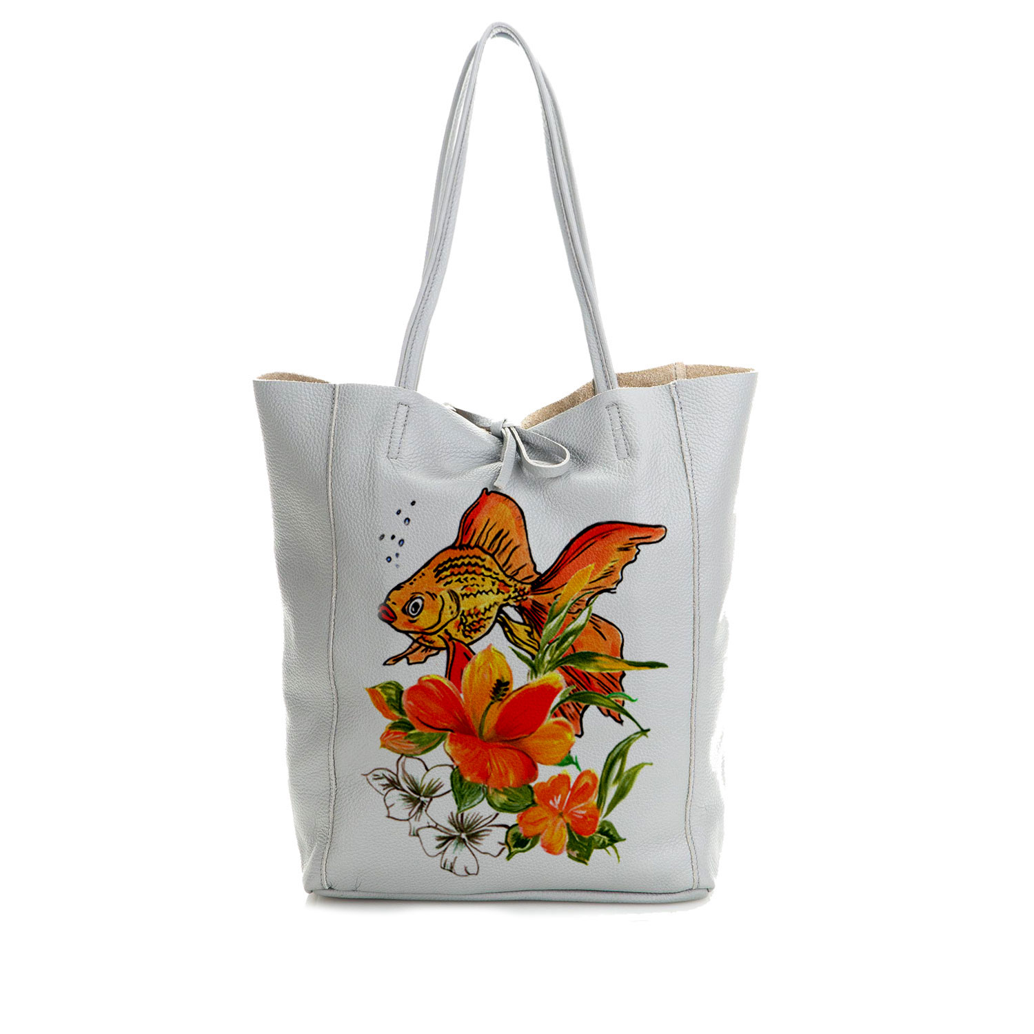 Borsa dipinta a mano – Fish and flowers: un simpatico pesce rosso e fiori sgargianti si abbinano con i toni dell’arancio per un eccentrico accessorio artigianale dipinto a mano