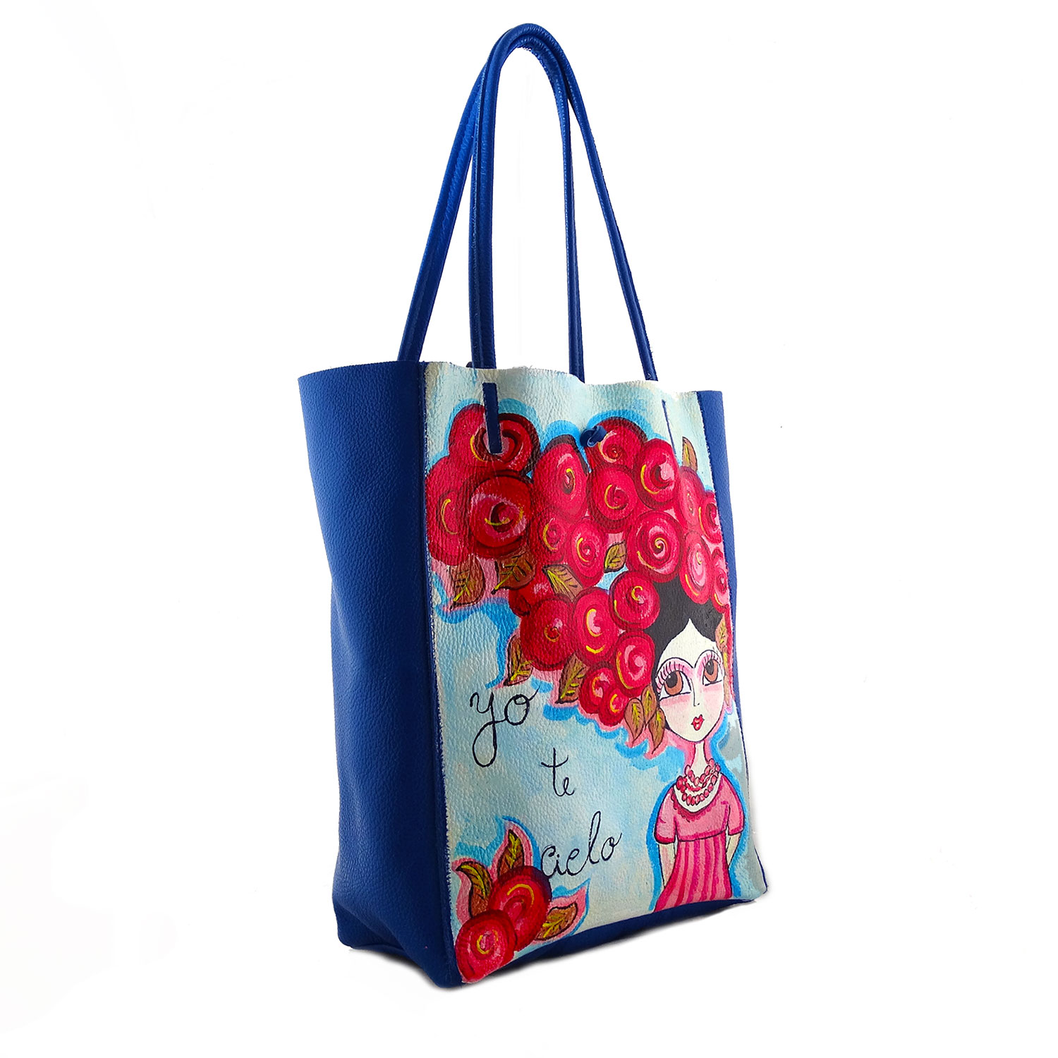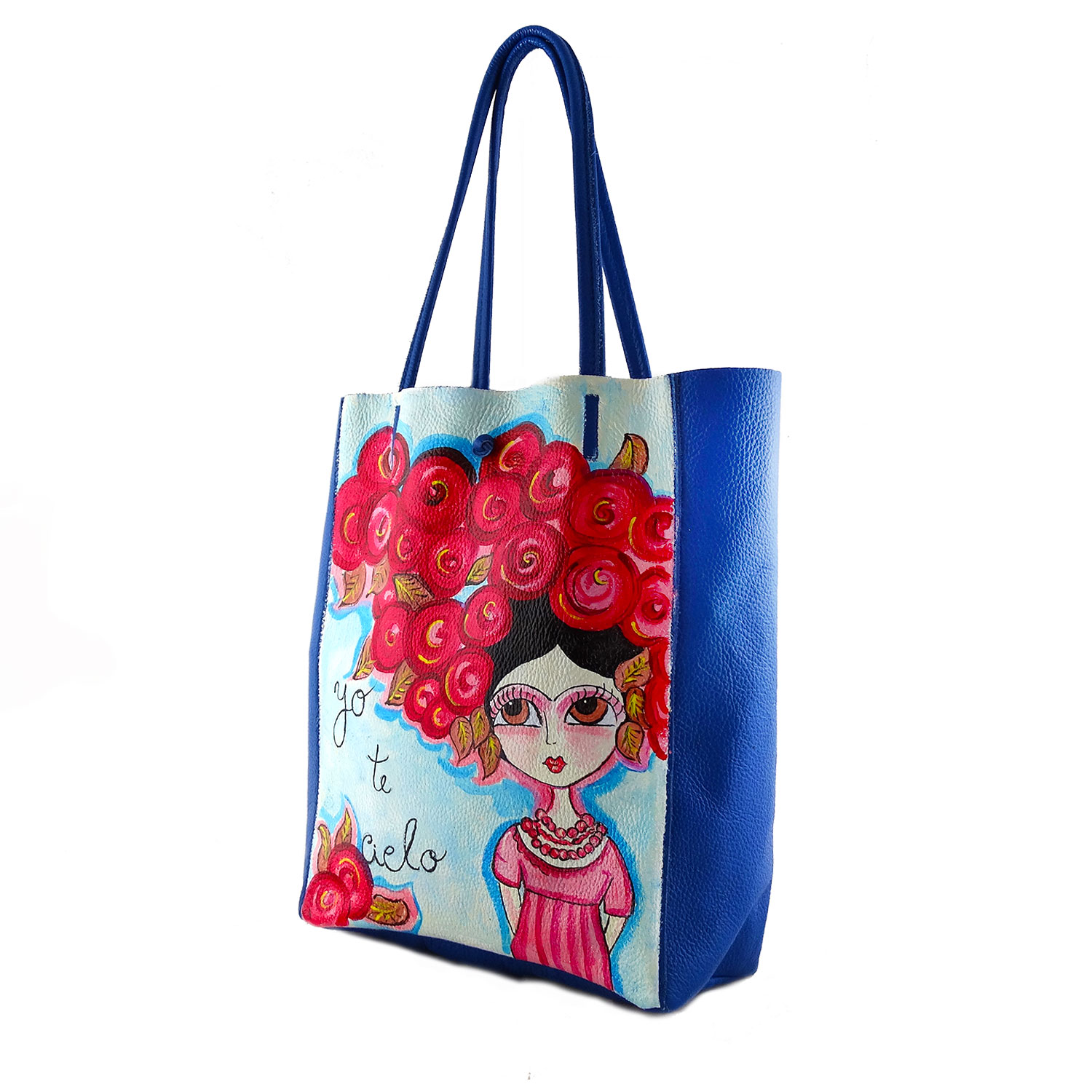 Borsa dipinta a mano – Frida yo te cielo: Sembra uscita da un cartoon questa borsa artigianale ArteLisanti che omaggia Frida Kahlo, in una interpretazione che ne vuole esaltare il suo lato gioioso e la voglia di vivere di chi la vita l’ ha amata appassionatamente.