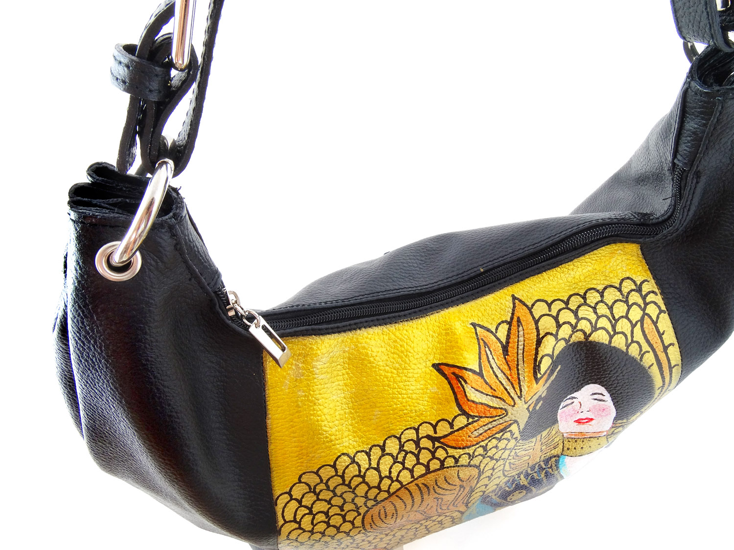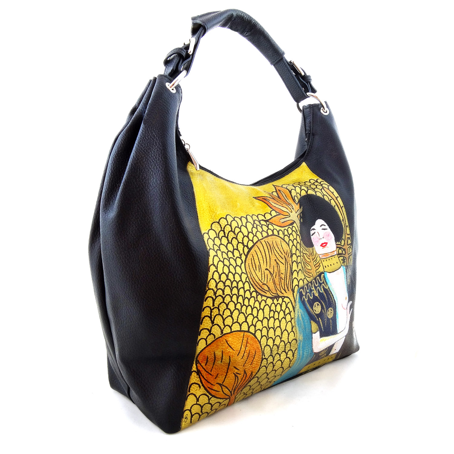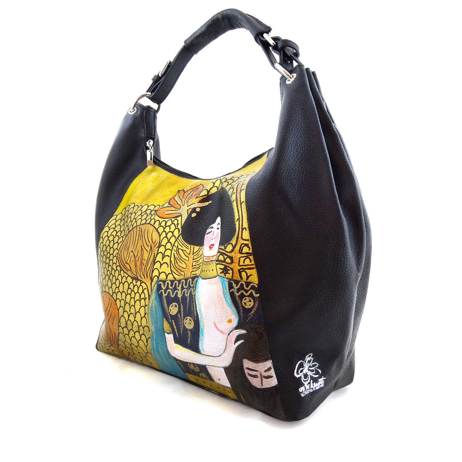 Borsa dipinta a mano – Giuditta di Klimt: Esaltazione della «femme fatal», metafora del potere di seduzione delle donne, che riesce a vincere anche la forza virile più bruta, tutto sottolineato dall’oro che rende brillante questa meravigliosa borsa dipinta a mano, per gridare la vostra femminilità.