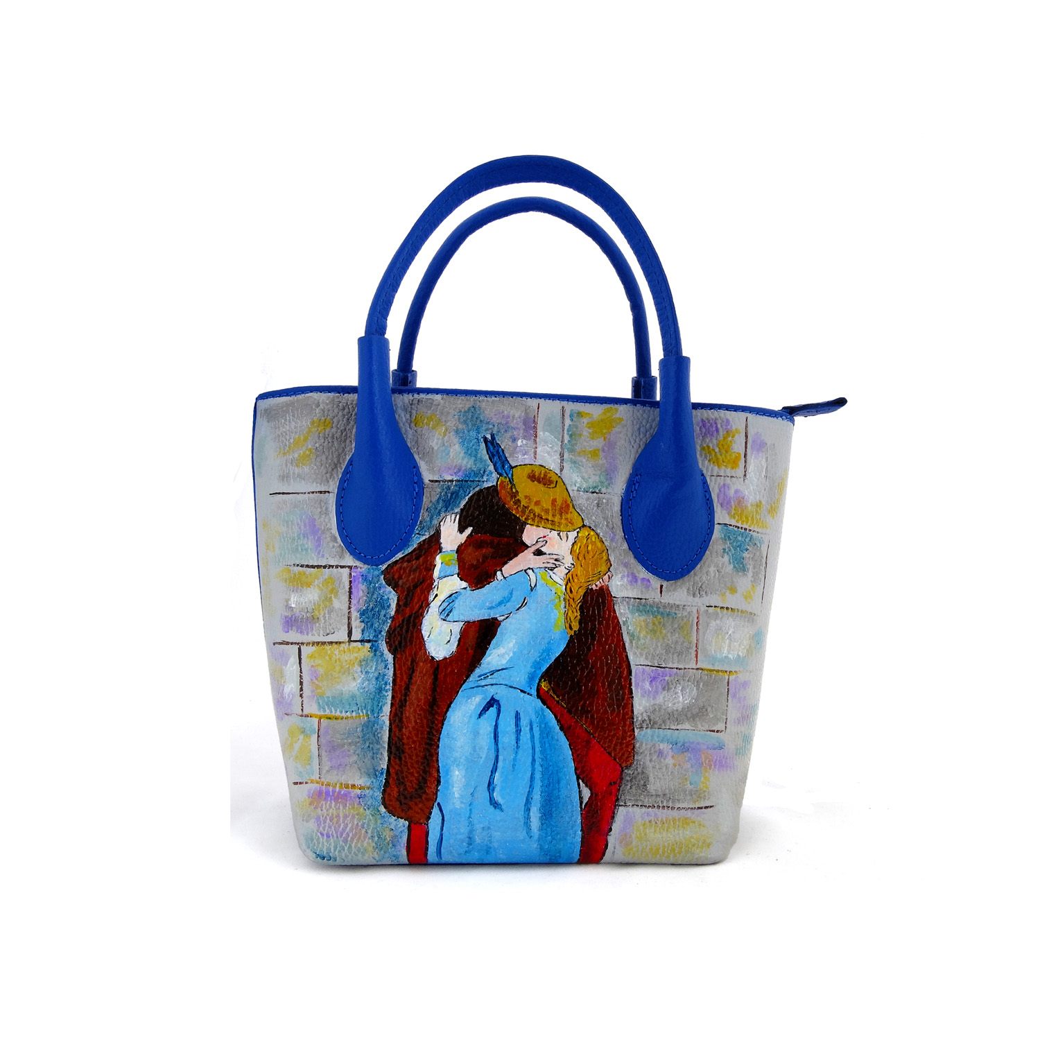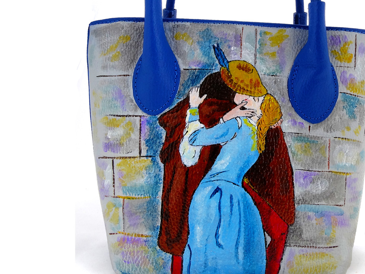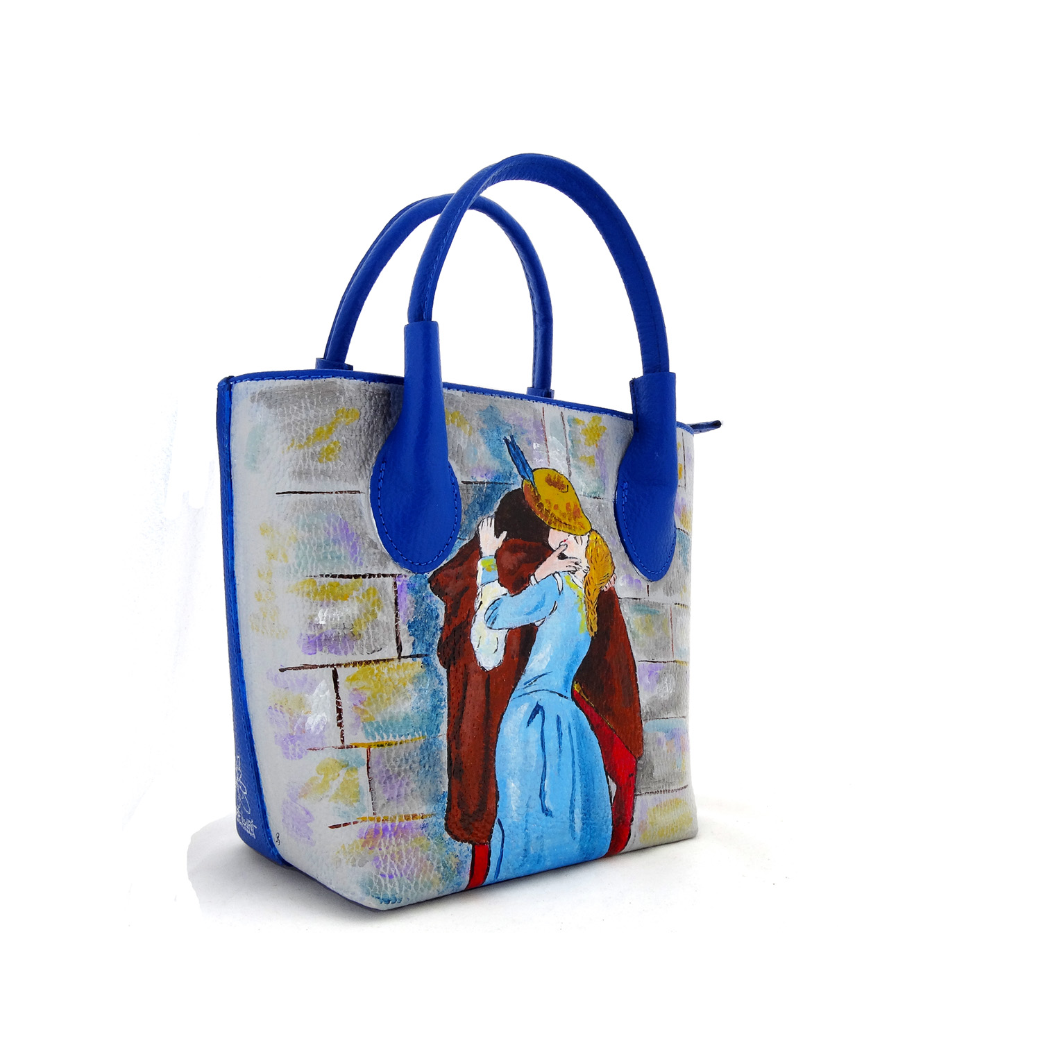 Borsa dipinta a mano – Il bacio di Hayez: Questo bellissimo capolavoro del Romanticismo Italiano, diventato un’icona per tanti innamorati è qui rivisitato da ArteLisanti con colori brillanti che lo rendono attuale e d’effetto.