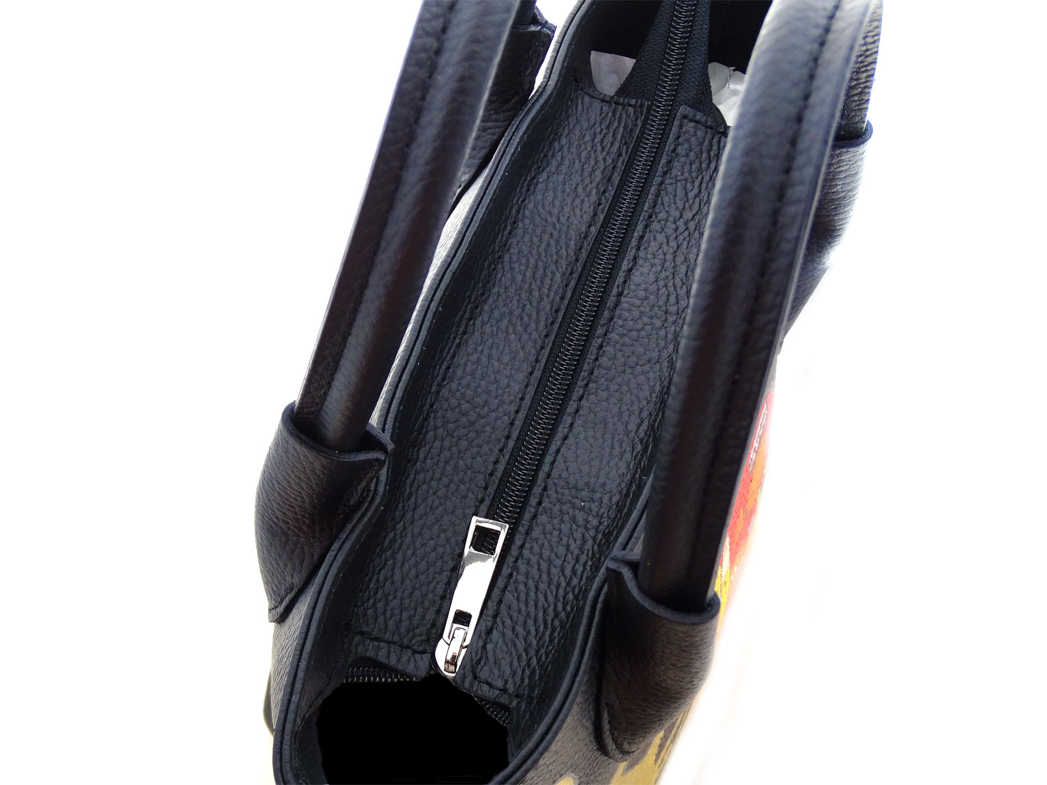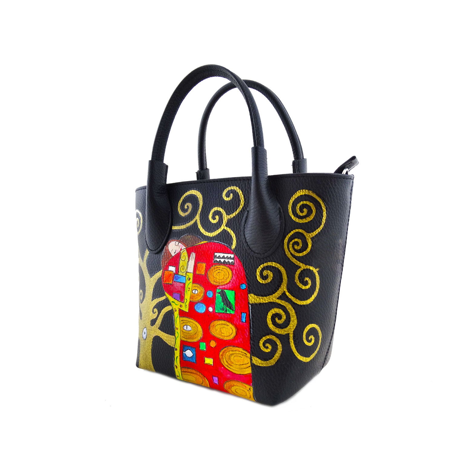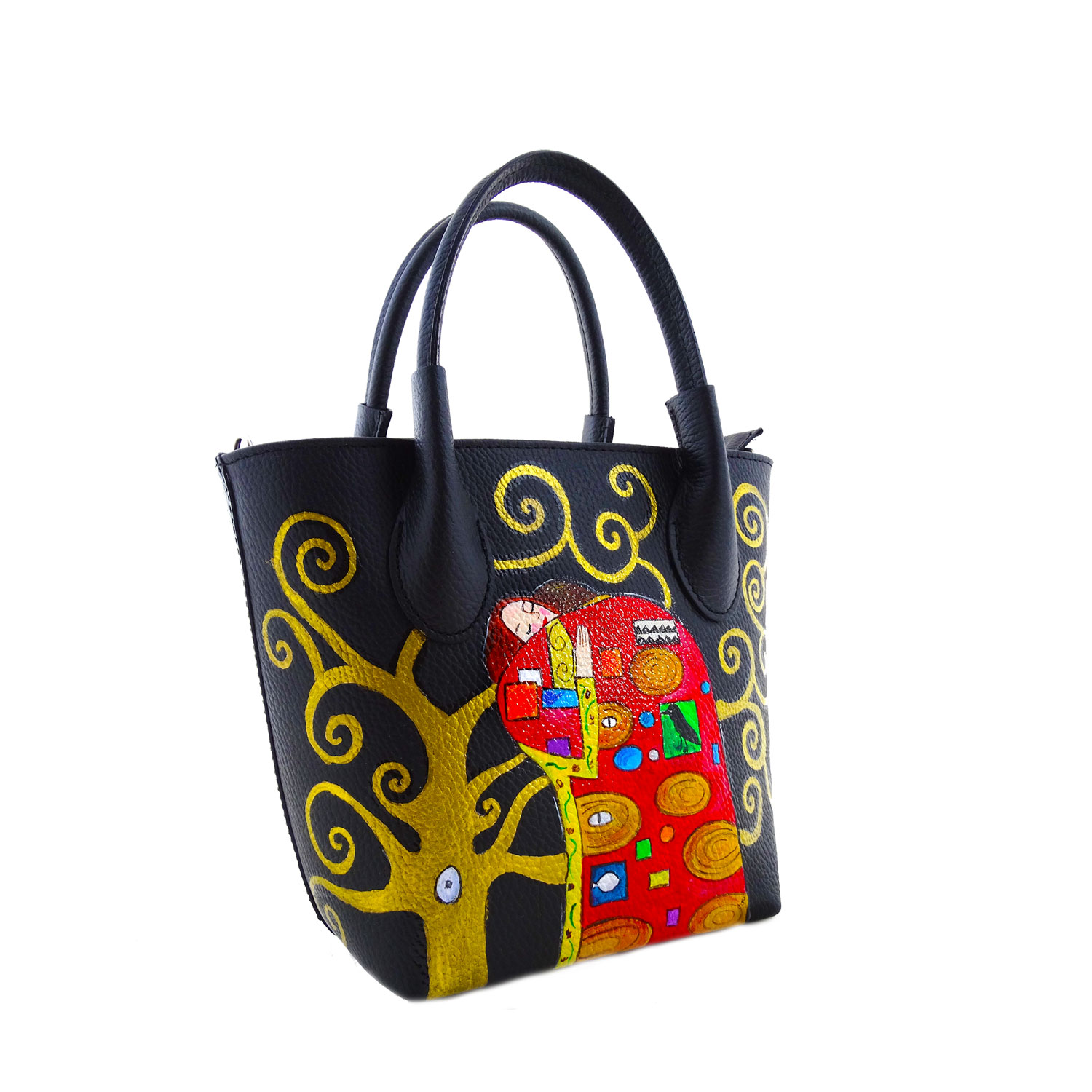 Borsa dipinta a mano – L’ abbraccio di Klimt: In questa pratica borsa da donna è rappresentato in primo piano il pannello destro di questo fantastico quadro. Ricco di dettagli.