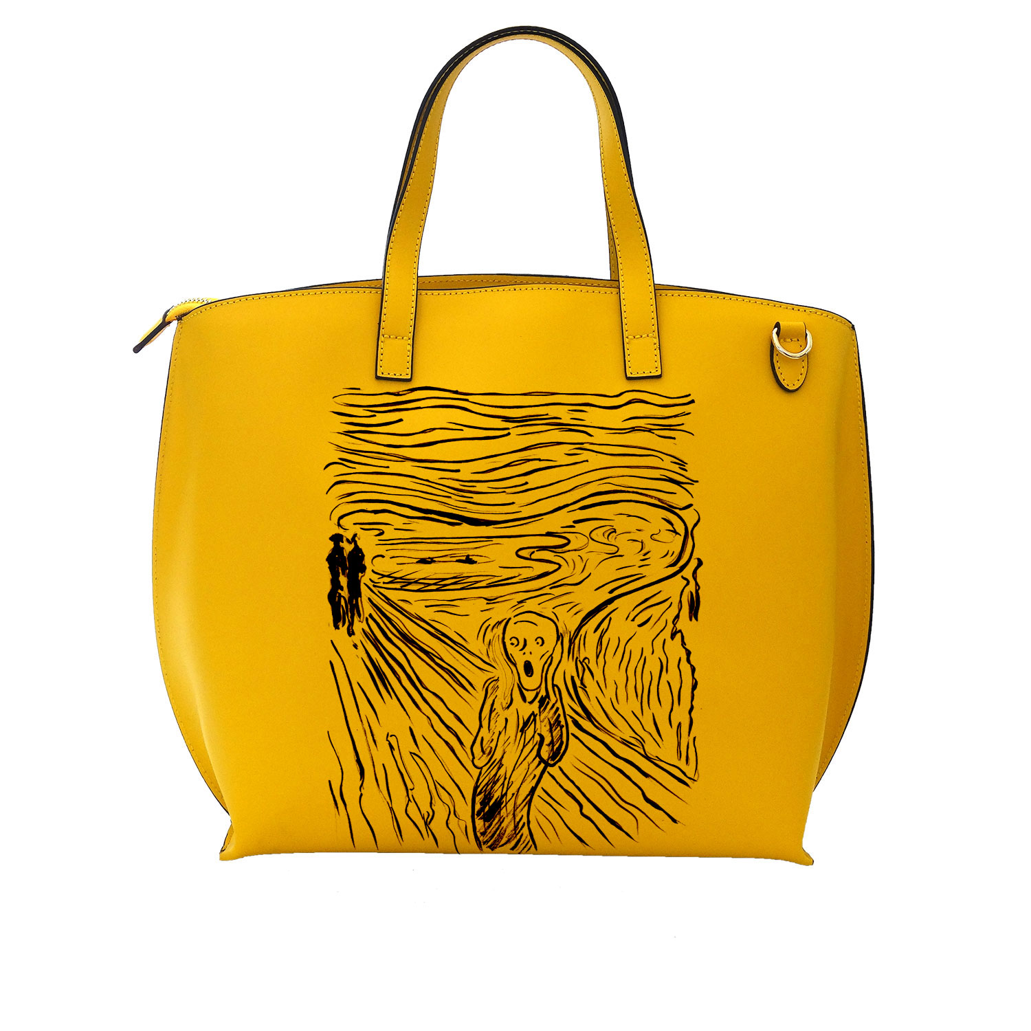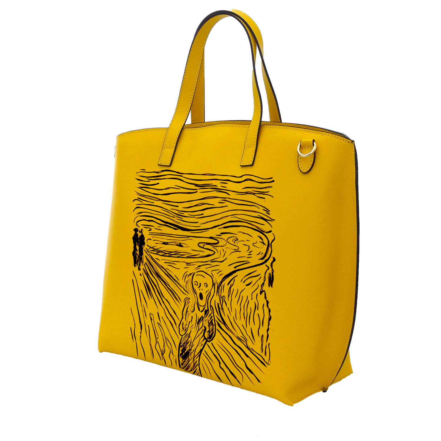 Borsa dipinta a mano: L’ urlo di Edward Munch cartoon black and yellow: anche conosciuto come “Il Grido” è uno dei quadri tra più famosi al mondo. Versione rivisitata in bianco e nero che sdrammatizza il tema delicato affrontato da Munch e rende il soggetto attuale e indicato per essere indossato. Per una borsa molto ampia a mano e tracolla artigianale da Urlo!. Una borsa dipinta a mano, completamente made in Italy. Tanto colore trovano spazio su una Maxi borsa artigianale. Il Risultato è un accessorio unico dai tratti dolci e stravaganti, 100% made in Italy.