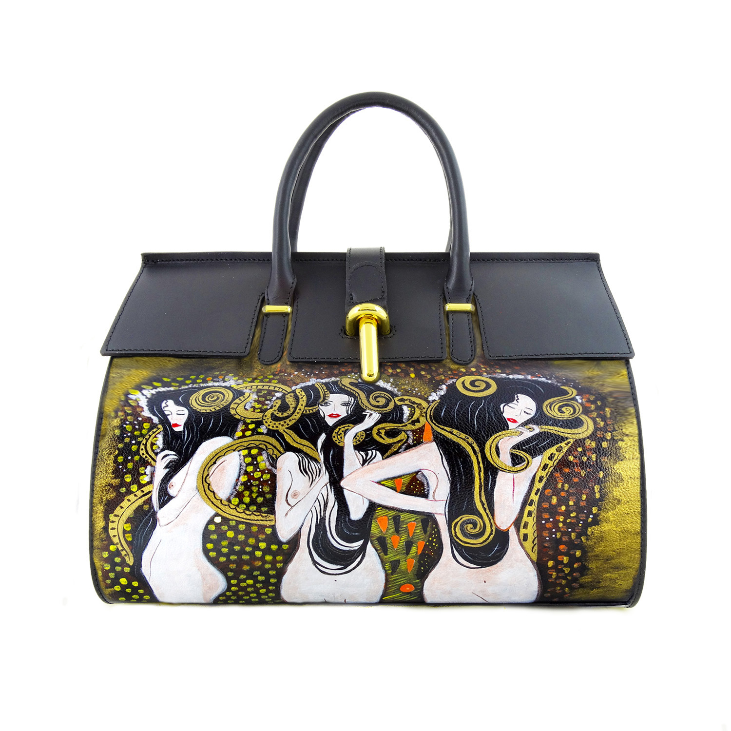 Borsa dipinta a mano – Le forze ostili di Klimt: Sensuali e candide figure femminili avvolte da volluosi serpenti dorati. E’ rappresentato un particolare del Fregio di Beethoven. Una borsa artigianale ricca di dettagli per un outfit assolutamente elegante.