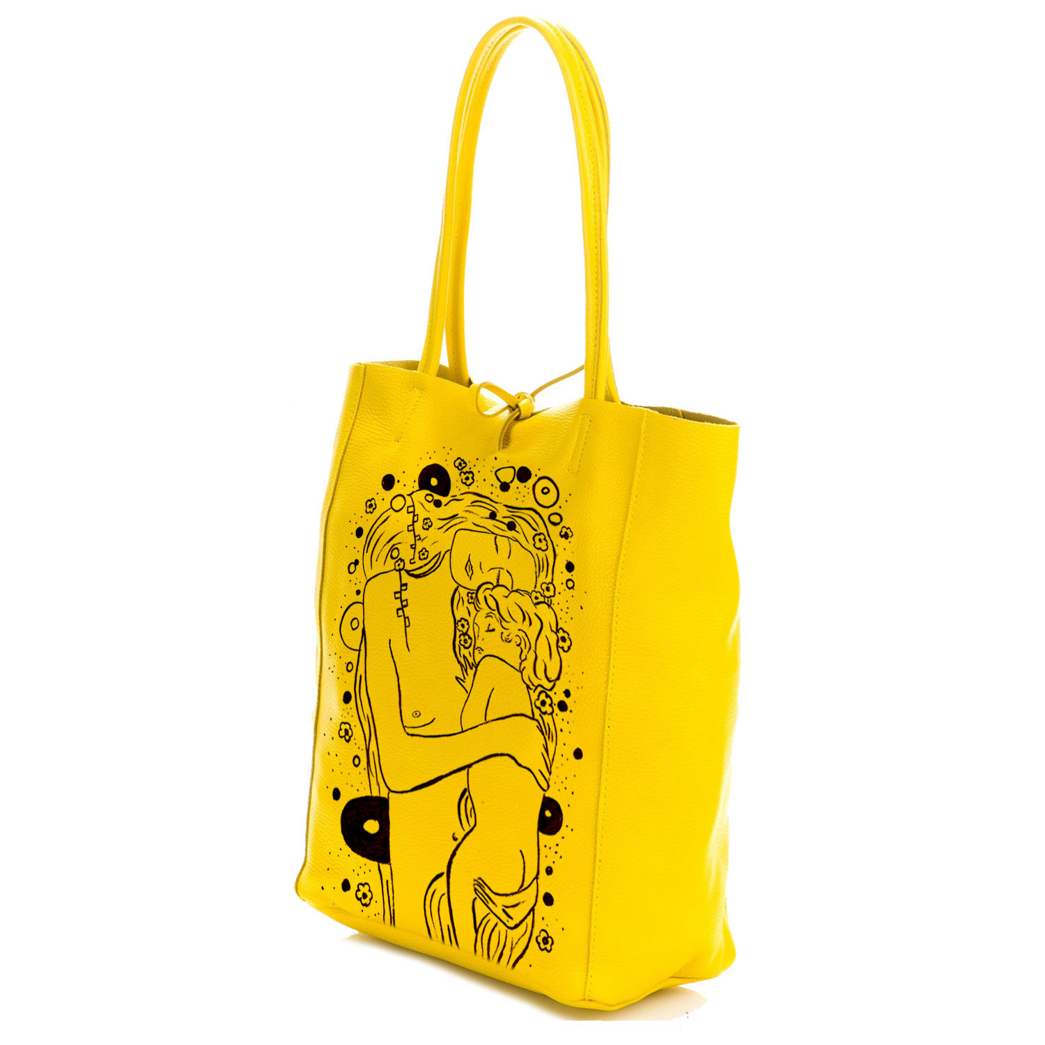 Borsa dipinta a mano – Madre e figlio di Klimt black and white: La Maternità di Klimt (dettaglio di “Le tre età della donna”) è senza dubbio il più dolce tra i suoi dipinti, dettagli oro e tanto colore trovano spazio su una Maxi borsa artigianale. Il Risultato è un accessorio unico dai tratti dolci e stravaganti, 100% made in Italy.