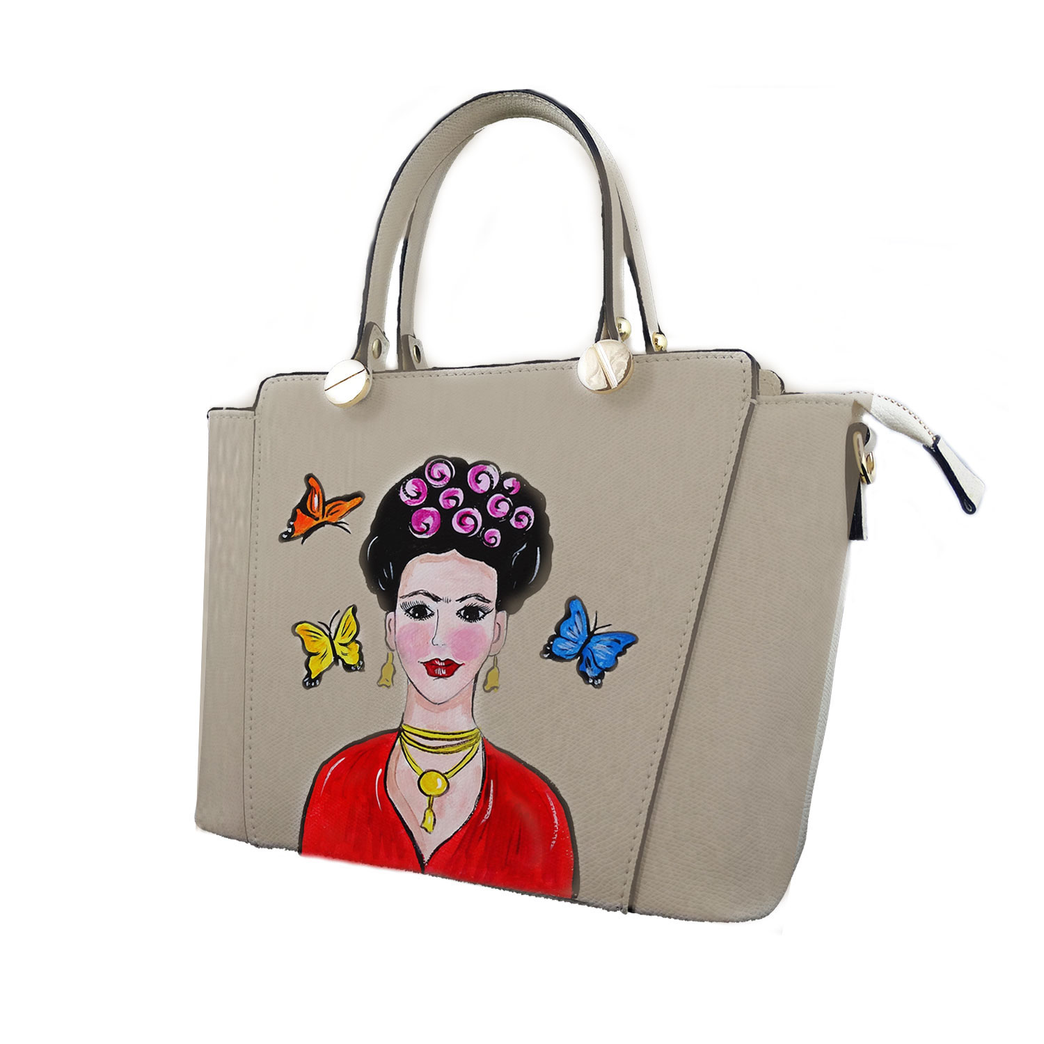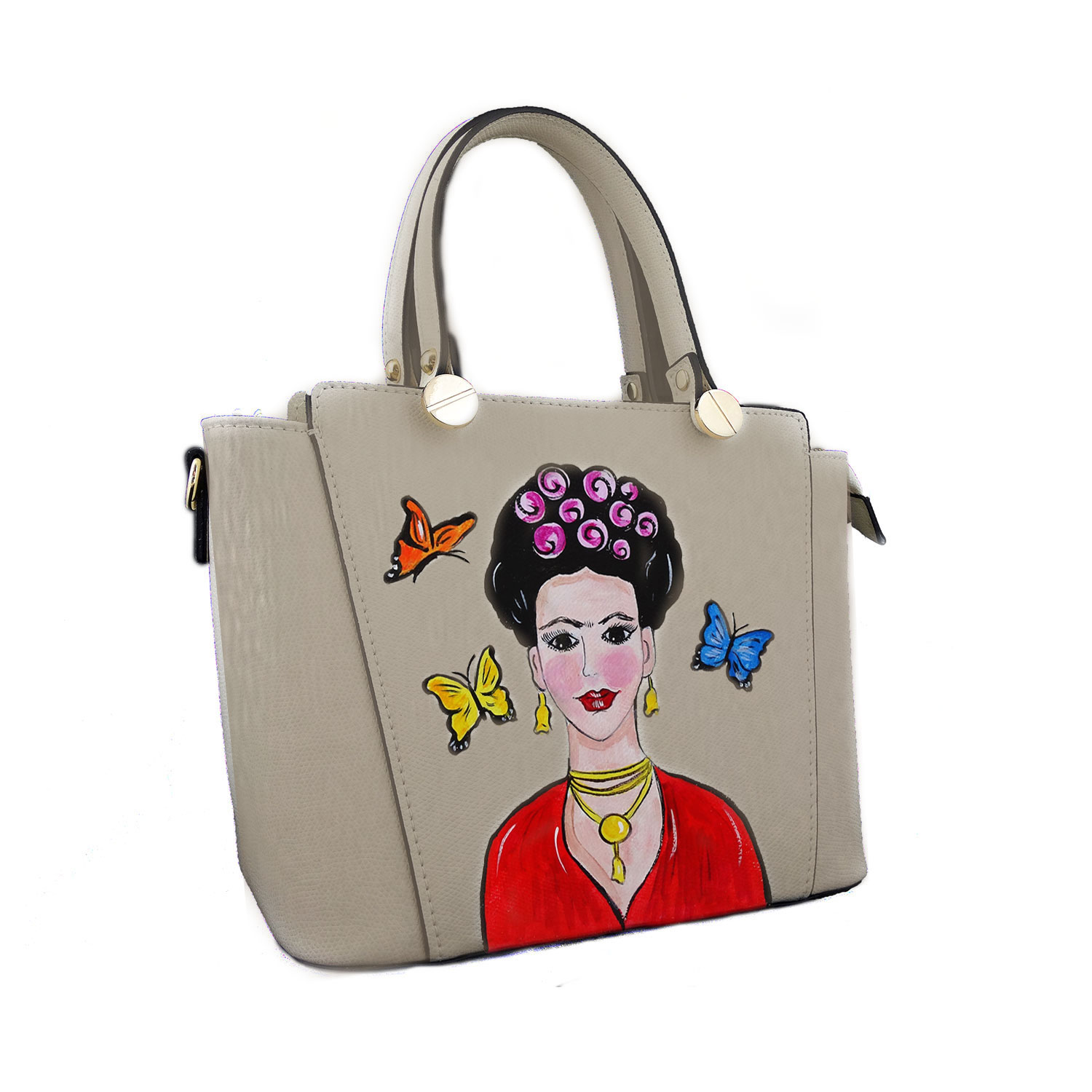 Borsa dipinta a mano – Mi Amor! Frida Kahlo: da una interpretazione che ne vuole esaltare il lato gioioso di Frida Kahlo e la voglia di vivere di chi come lei la vita l’ ha amata appassionatamente. Passionale, giocosa, curiosa. Queste sono le caratteristiche di questo accessorio che omaggia Frida Kahlo, la famosa pittrice messicana vissuta nella prima metà del ‘900.
