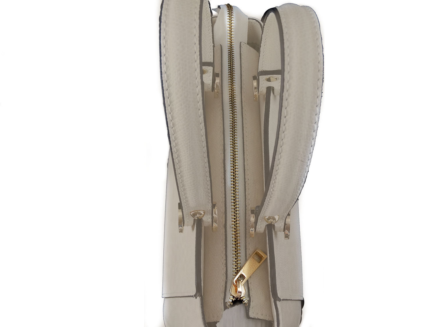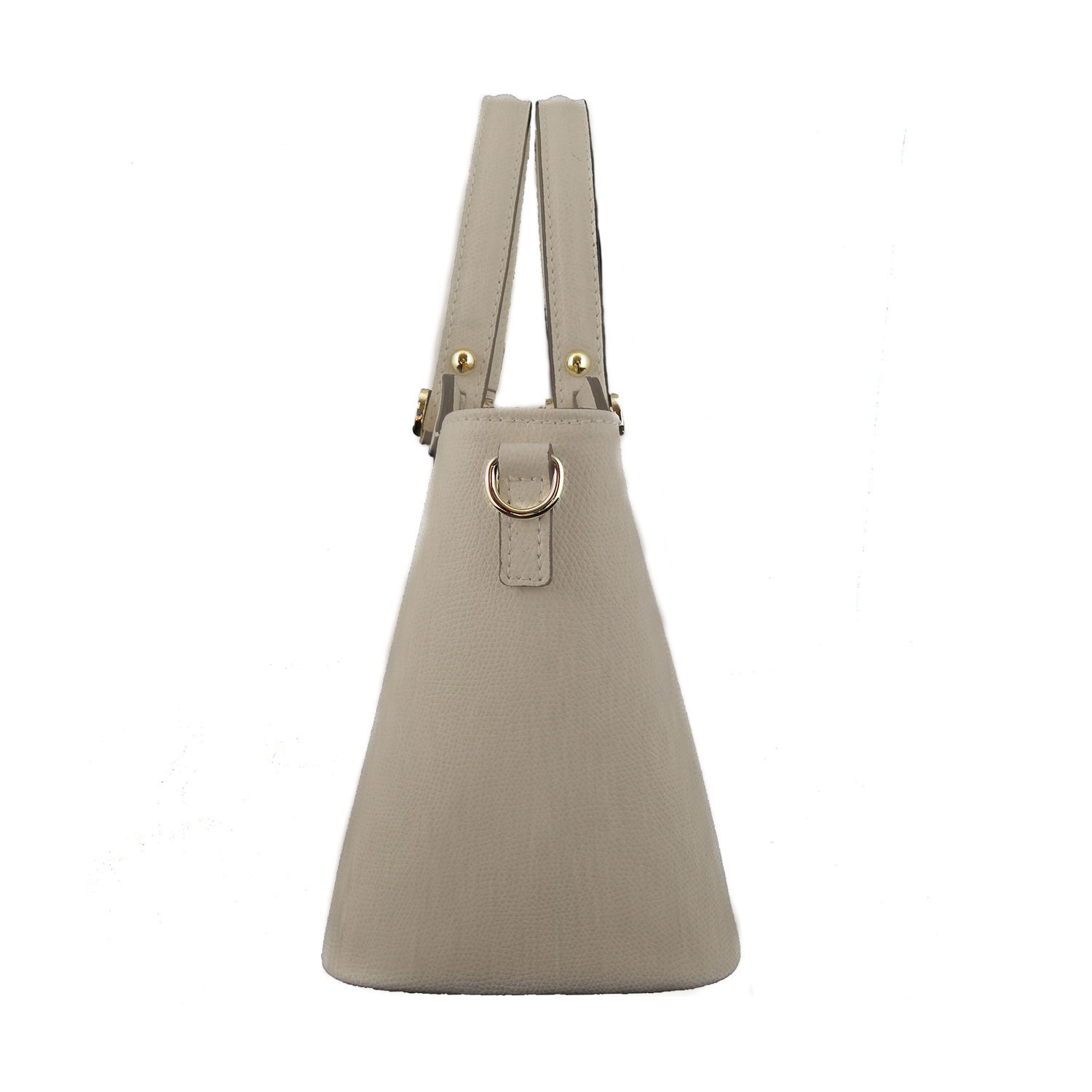 Esterni: Borsa a mano – Vera pelle – Chiusura con Zip – Accessori in metallo color oro Interni: Tasca interna portadocumenti con zip – 2 scomparti – Fodera in poliestere Accessori: Tracolla montabile ad esigenza Dimensioni: 24 cm x 20 cm x 14 cm