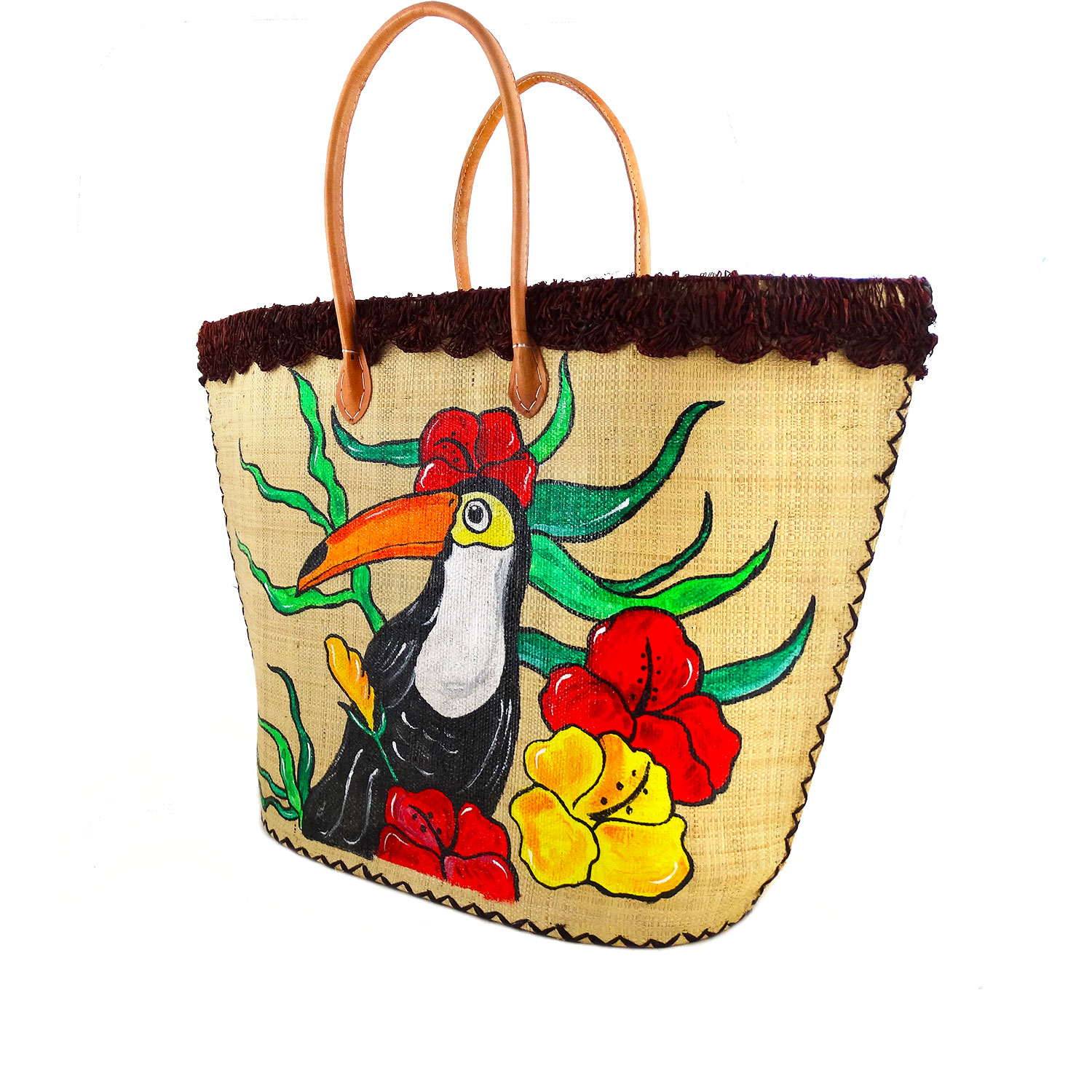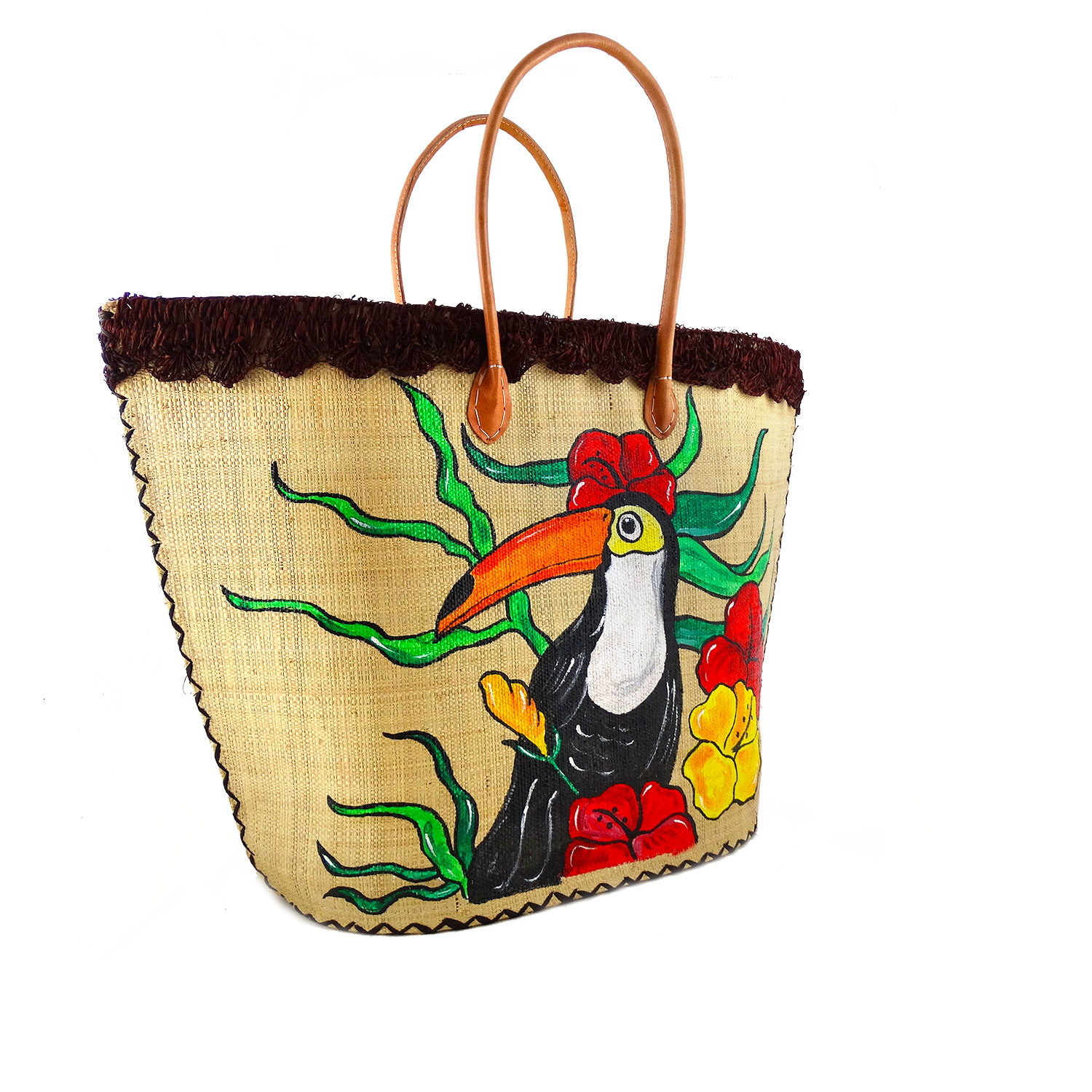 Borsa dipinta a mano – Tucano: una splendida borsa davvero molto ampia artigianale in rafia 100% naturale con dipinti a mano un simpatico tucano tra i fiori tropicali, una borsa in paglia perfetta per la spiaggia.