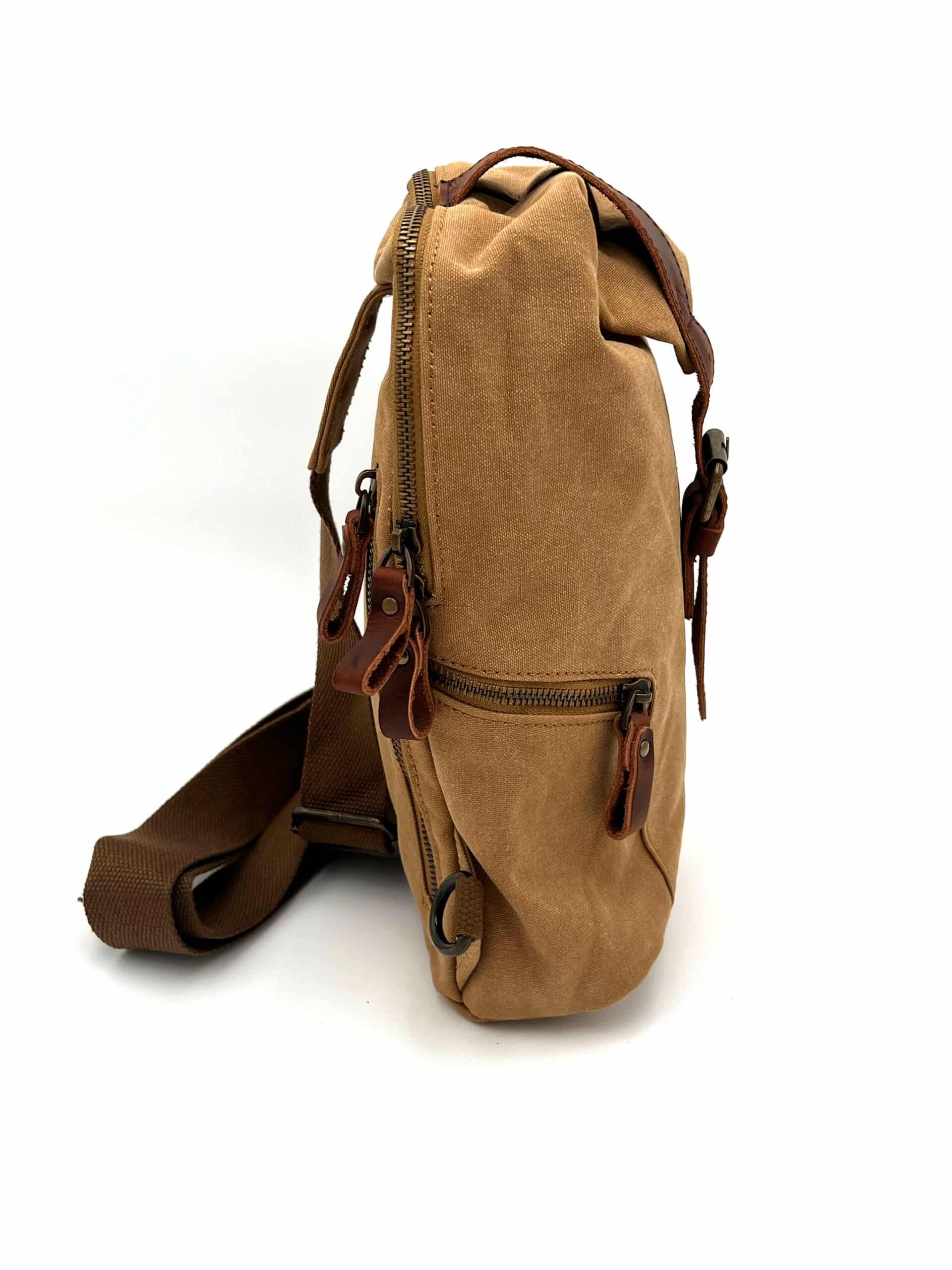 Borsello Canvas di cotone e pelle vegetale. Il Canvas è conosciuto per essere un tessuto resistente e pregiato, pensato per l’uso quotidiano. Compatto ma funzionale, offre un’organizzazione ottimale grazie a tre tasche esterne e due interne.
