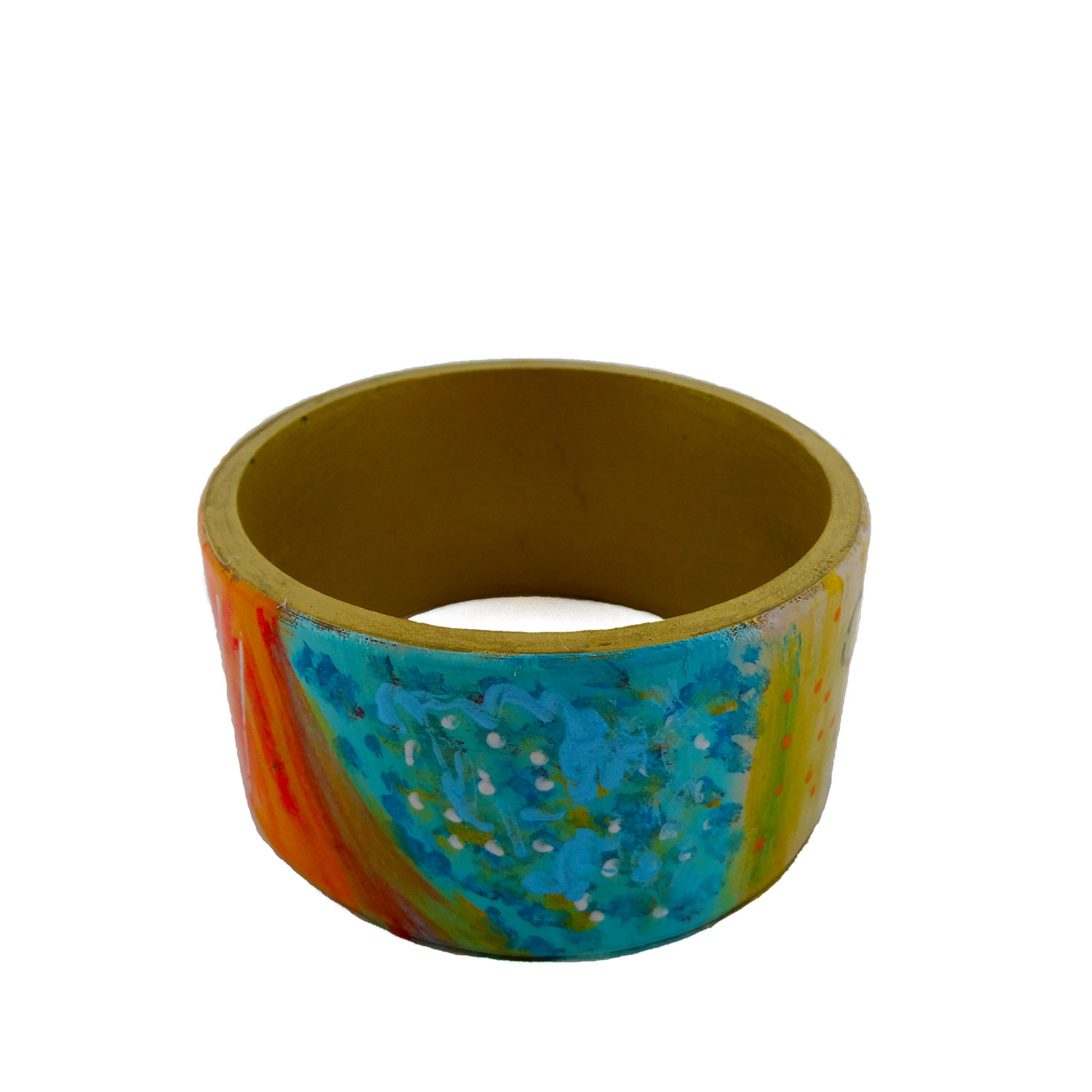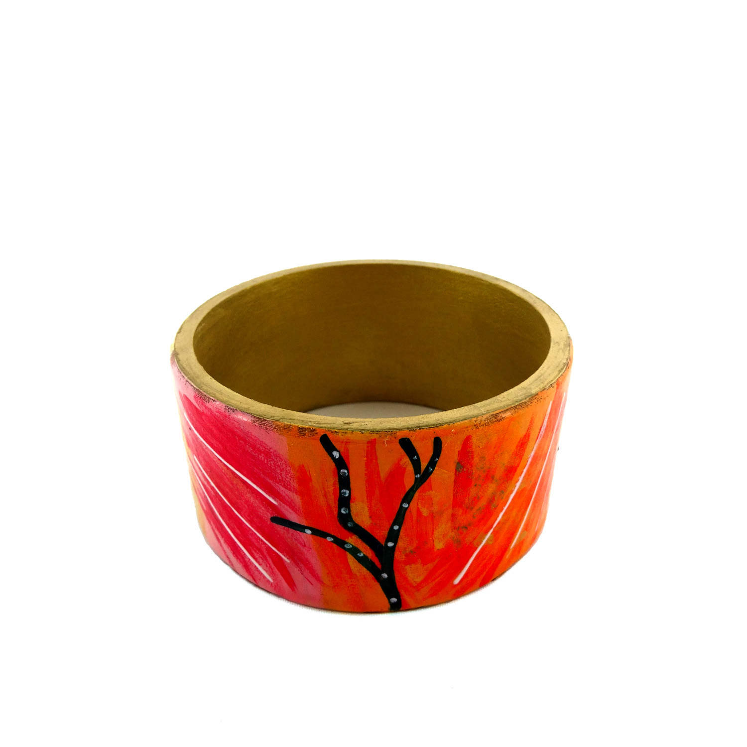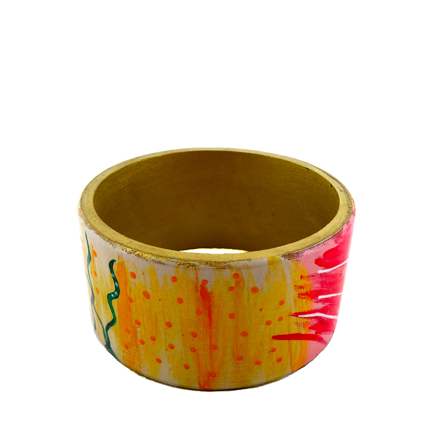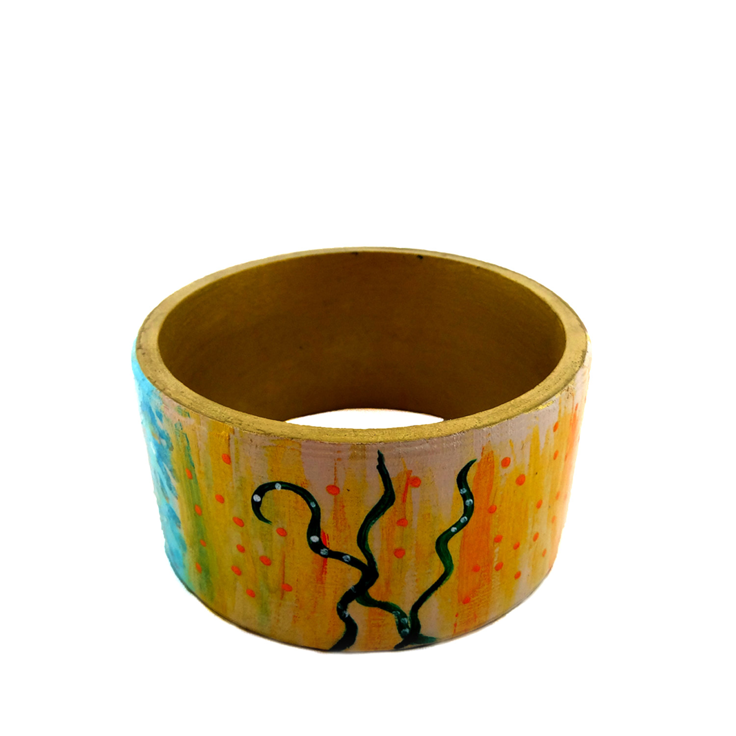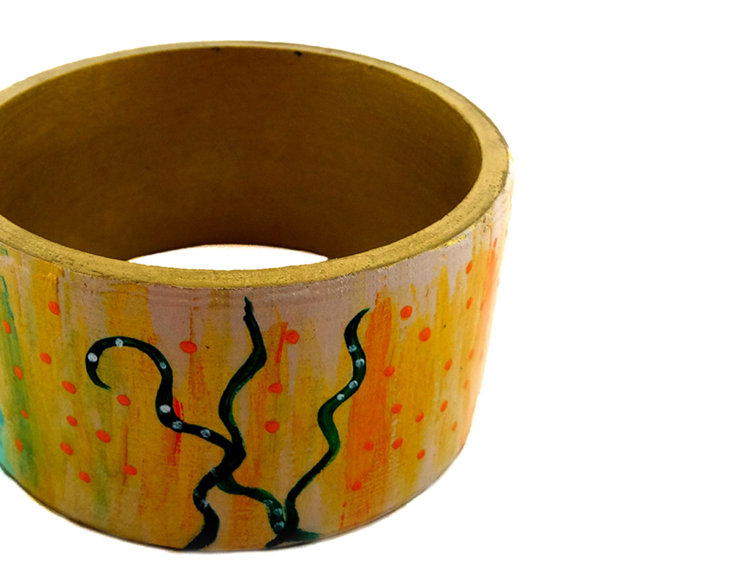 Bracciale dipinto a mano – Giardino incantato: Pennellate dolci, linee sinuose, dettagli oro in rilievo per un “Giardino Incantato” dai tratti astratti, dipinto a mano su un delizioso bracciale.