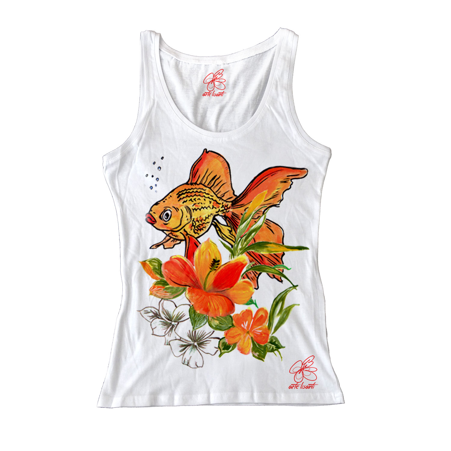Canotta dipinta a mano – Fish and flowers: un simpatico pesce rosso e fiori sgargianti si abbinano con i toni dell’arancio per un eccentrico accessorio artigianale dipinto a mano