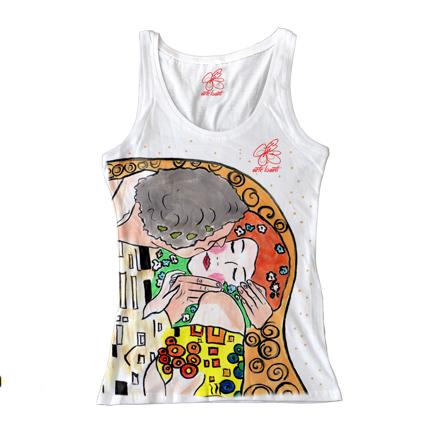 Canotta dipinta a mano – Il bacio di Klimt cartoon color: Il bacio è probabilmente il quadro più famoso di Gustav Klimt, ed è proposto da ArteLisanti su una meravigliosa canotta dipinta a mano che ne esalta le varie gradazioni dell’oro. Per un outfit elegante e decisamente romantico.