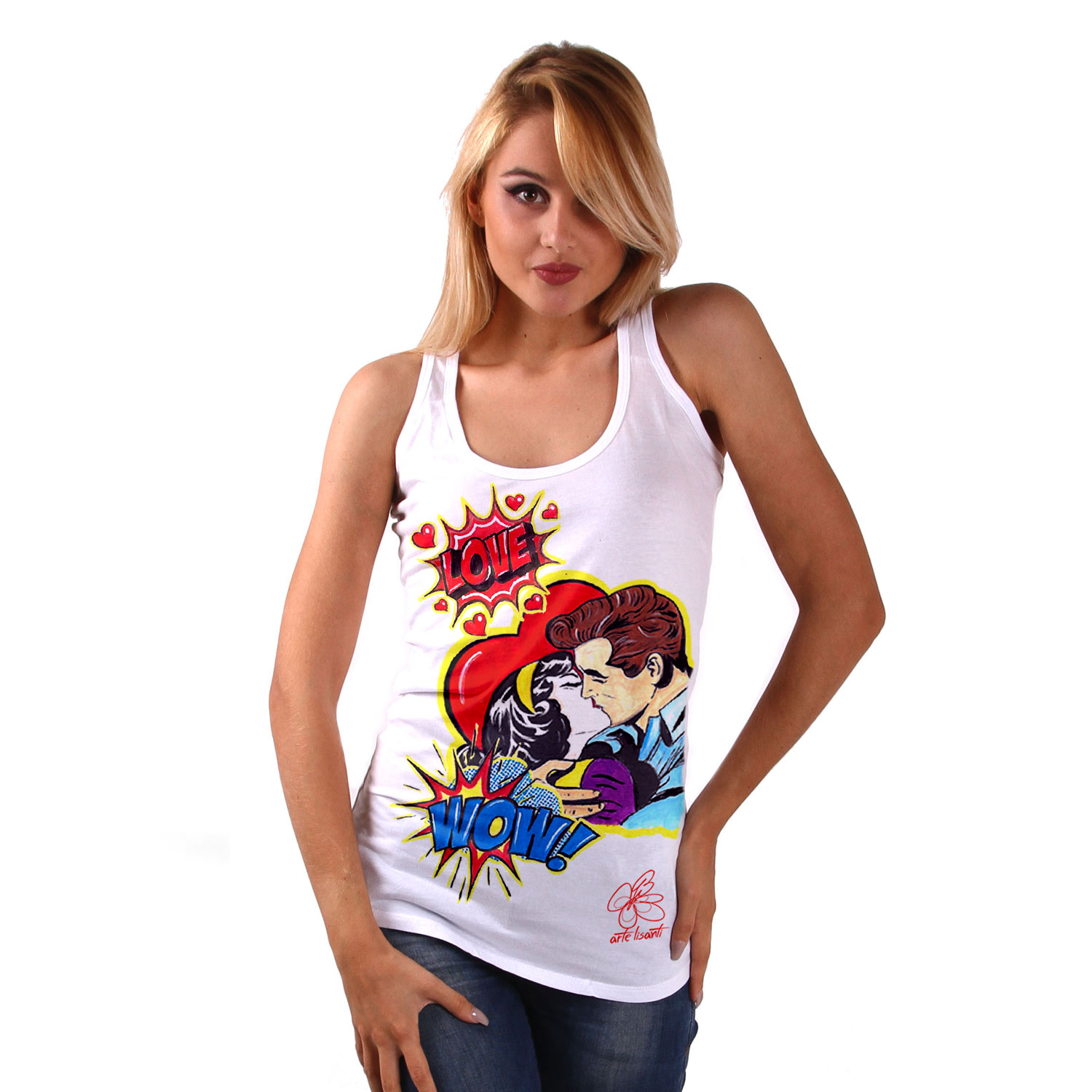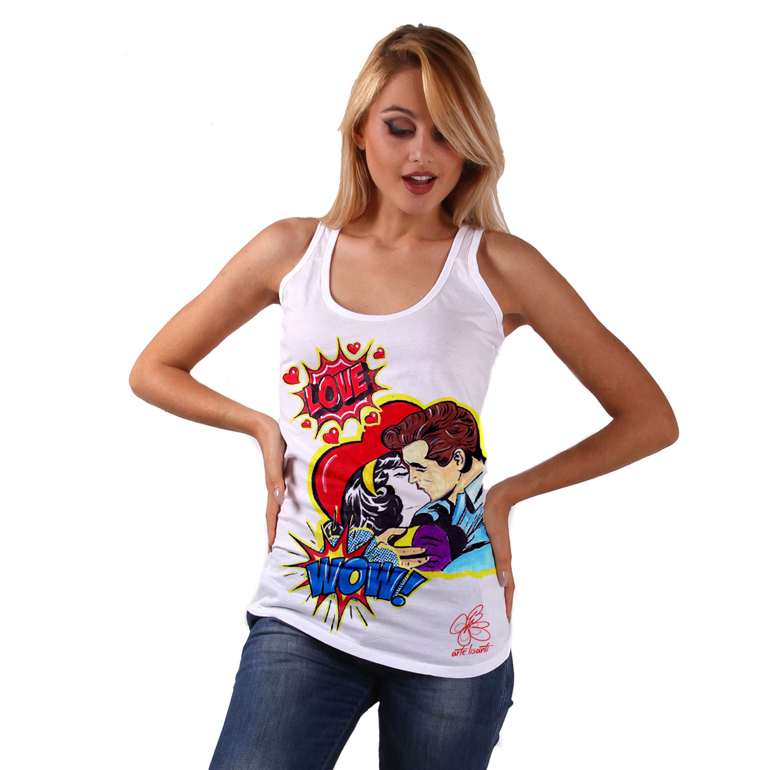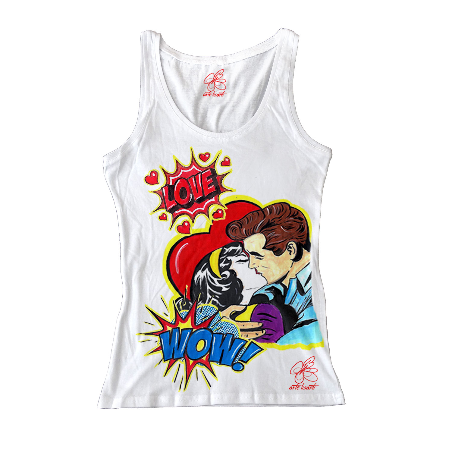 Canotta dipinta a mano – Love, omaggio a Roy Lichtenstein: Si omaggia il mondo dei fumetti che entrò a far parte della Pop Art grazie a Lichtenstein, con i suoi colori brillanti e le tipiche scritte che enfatizzano i suoni. Il tema è l’amore sottolineato da un bacio appassionato e dai cuori.