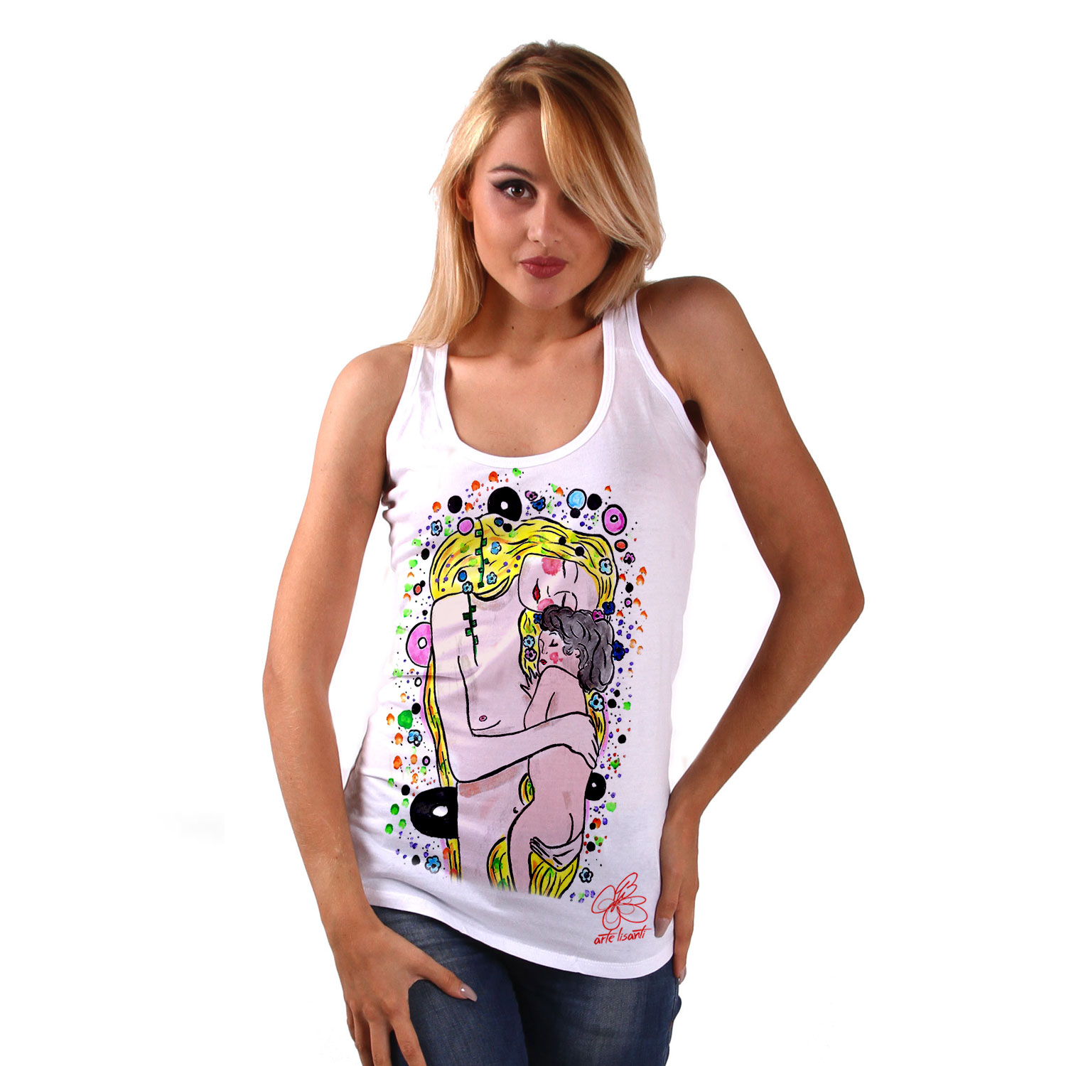 Canotta dipinta a mano – Madre e figlio di Klimt cartoon color: La Maternità di Klimt (dettaglio di “Le tre età della donna”) è senza dubbio il più dolce tra i suoi dipinti, dettagli oro e tanto colore trovano spazio su un accessorio artigianale. Il Risultato è unico dai tratti dolci e stravaganti, 100% made in Italy.