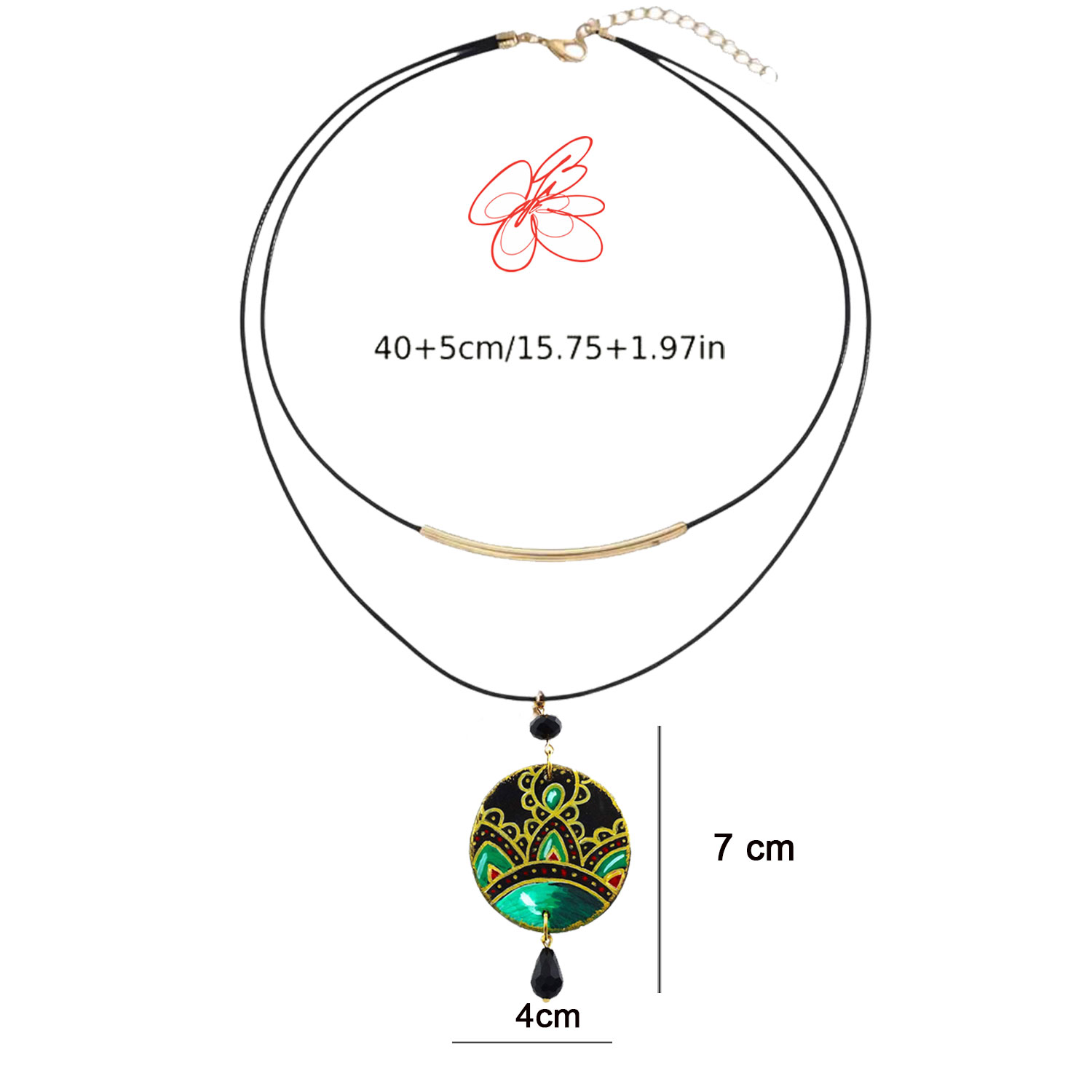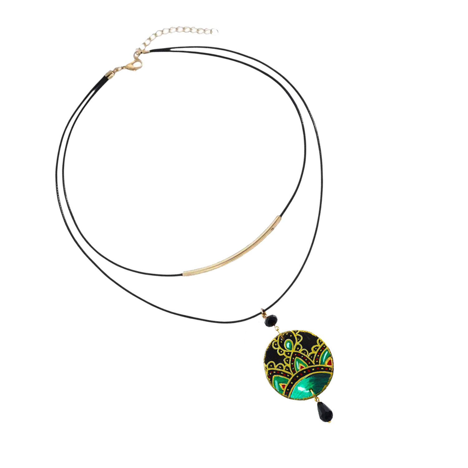 Pendente dipinto a mano Dimensioni : lunghezza collana 40 cm più 5 cm regolabili, ciondolo cerchio 4 cm di diametro Materiale: Cordino cerato impermeabile, Metallo Nichel free, Legno, Vetro Protezione: Resina spessa effetto vetro per proteggere il dipinto Collana con chiusura regolabile