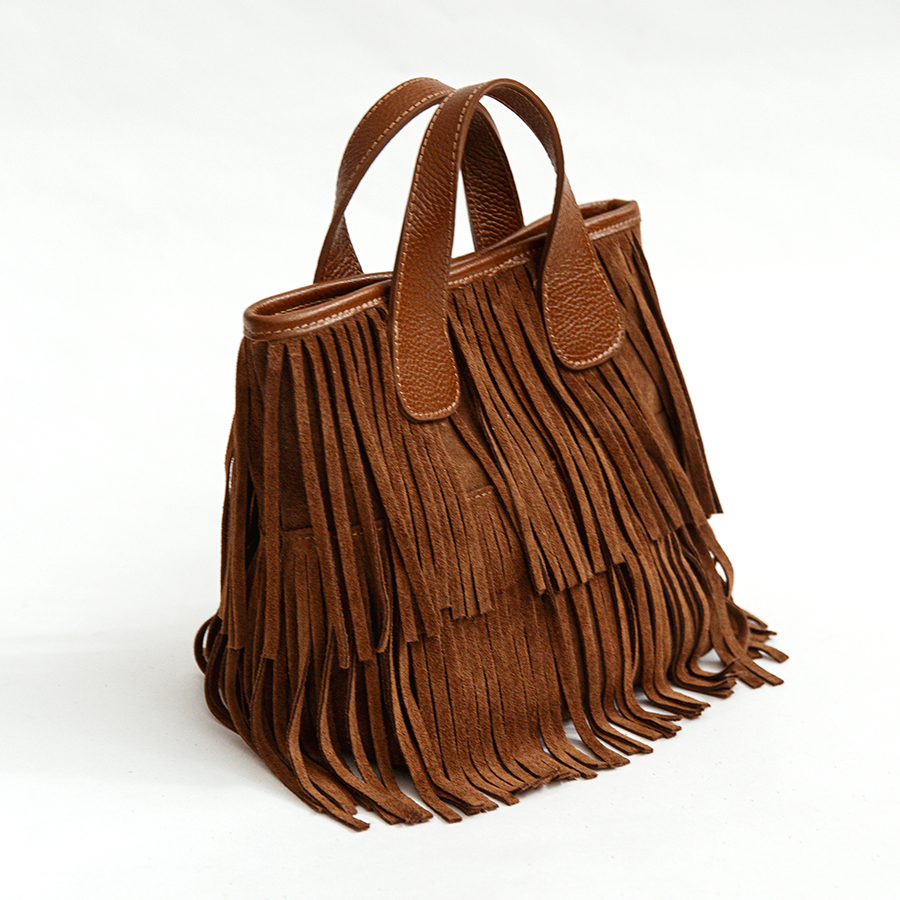 Borsa di medie dimensioni in camoscio con frange. Doppio manico con tracolla applicabile. Chiusura a calamita e interno foderato con tasche. Accessori colore oro.