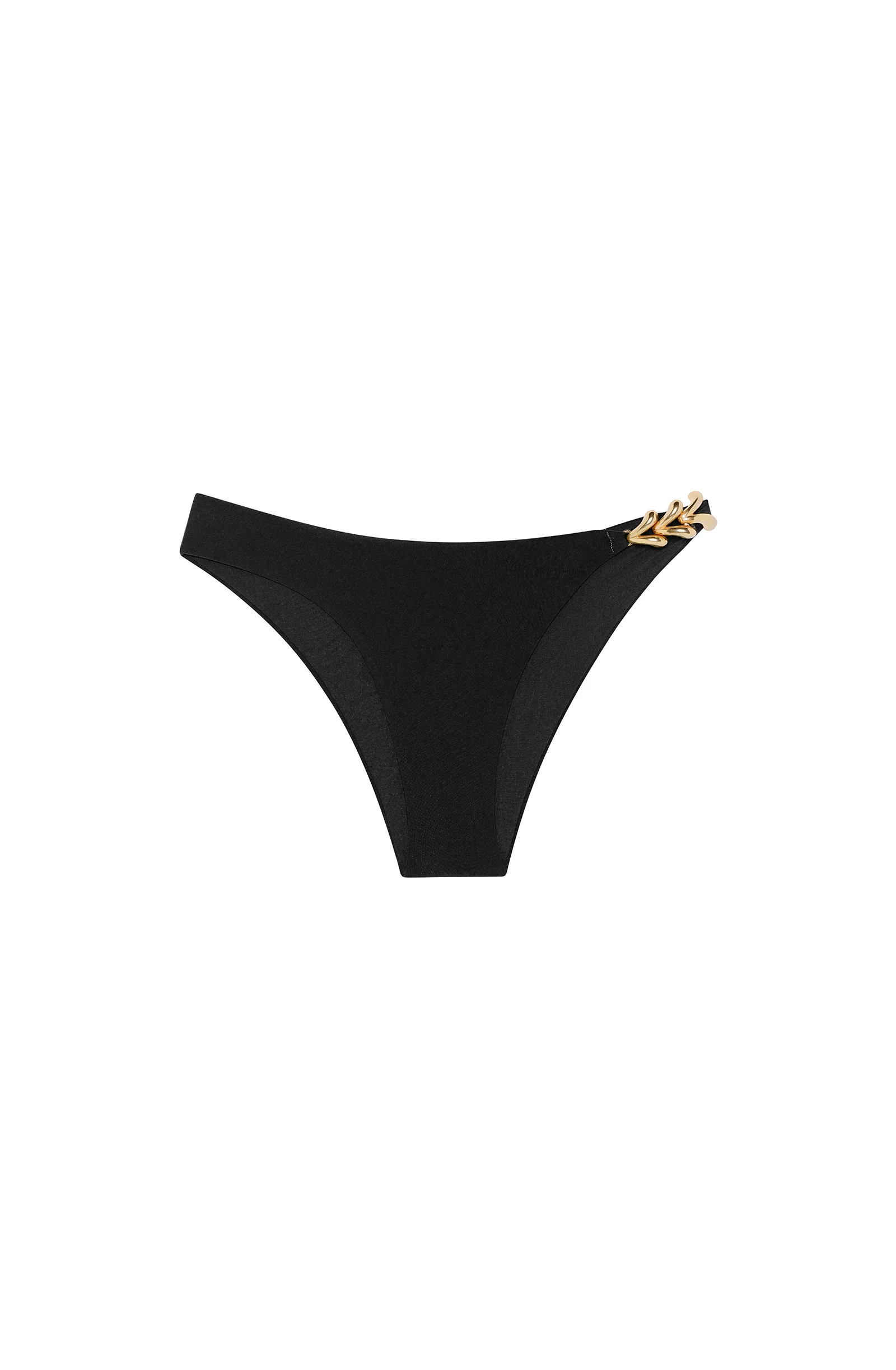 Asymmetric bikini bottoms Golden cob-shaped braid jewel on the left side Hidden seam assembly Fully lined 71% polyamide, 29% elastane Graphic and elegant, the low-waisted bikini bottoms DANI feature an elegant cob-plait-like golden jewel on the left hip. This swimsuit delicately and elegantly plays with asymmetry. Black, a timeless colour that is always elegant.